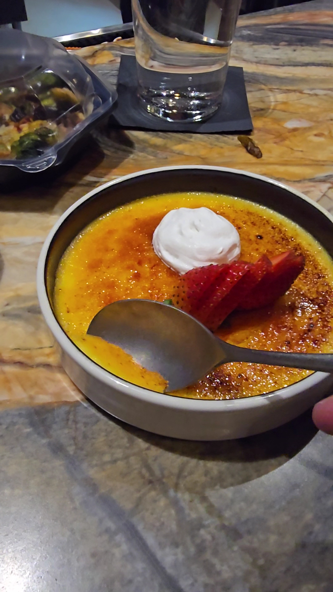 We also ordered the crÚme brûlée last night, which had very little of the crackly top, and had the texture of a no bake cheesecake.