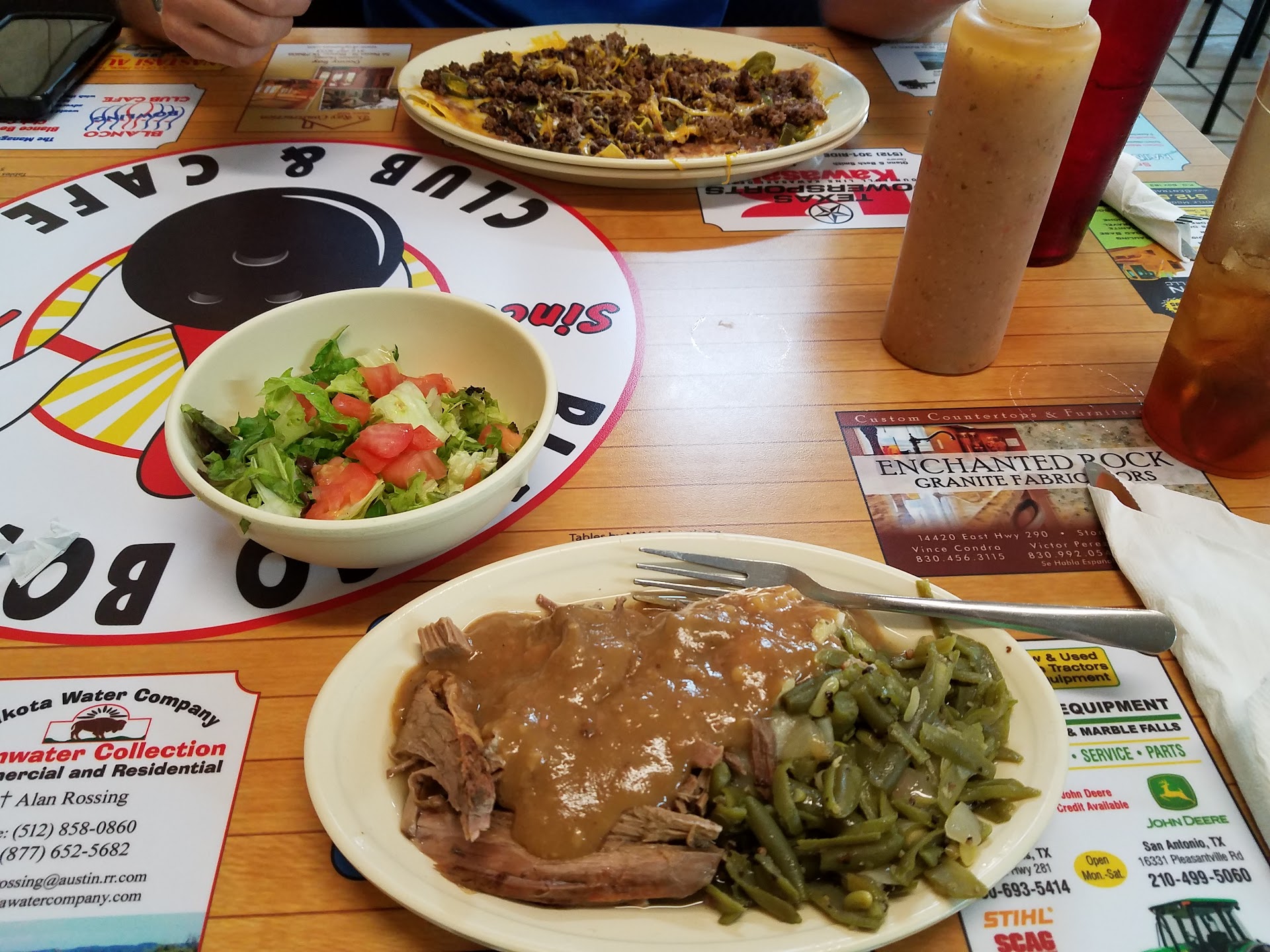 This is a place where mostly locals gather to chat over an inexpensive meal. Most of the wait staff is friendly and good at what they do. The bathrooms are awkwardly placed but very clean and always stocked. The tables and chairs are clean, and I have never had a dirty cup, plate, fork, etc. The biggest problem would have to be in the kitchen. It seems that they struggle to find consistent and experienced cooks that are fast and efficient. Many times they are REALLY slow to get your order out. Other times the breakfast pastries are burnt or undercooked. My husband has ordered 2 breakfast tacos to go several times and had to buy a doughnut instead and leave because it took them longer than 15 sometimes 20 minutes and they still weren't ready. However, when the food does come, it is done correctly about 99% of the time. Breakfast tacos are some of the biggest and best in town, along with their homemade salsa! But there is nothing really special about this place, and I would never choose it as a place to eat when going out with my husband on a date. Like I said, it is a place where most of the older locals gather to...