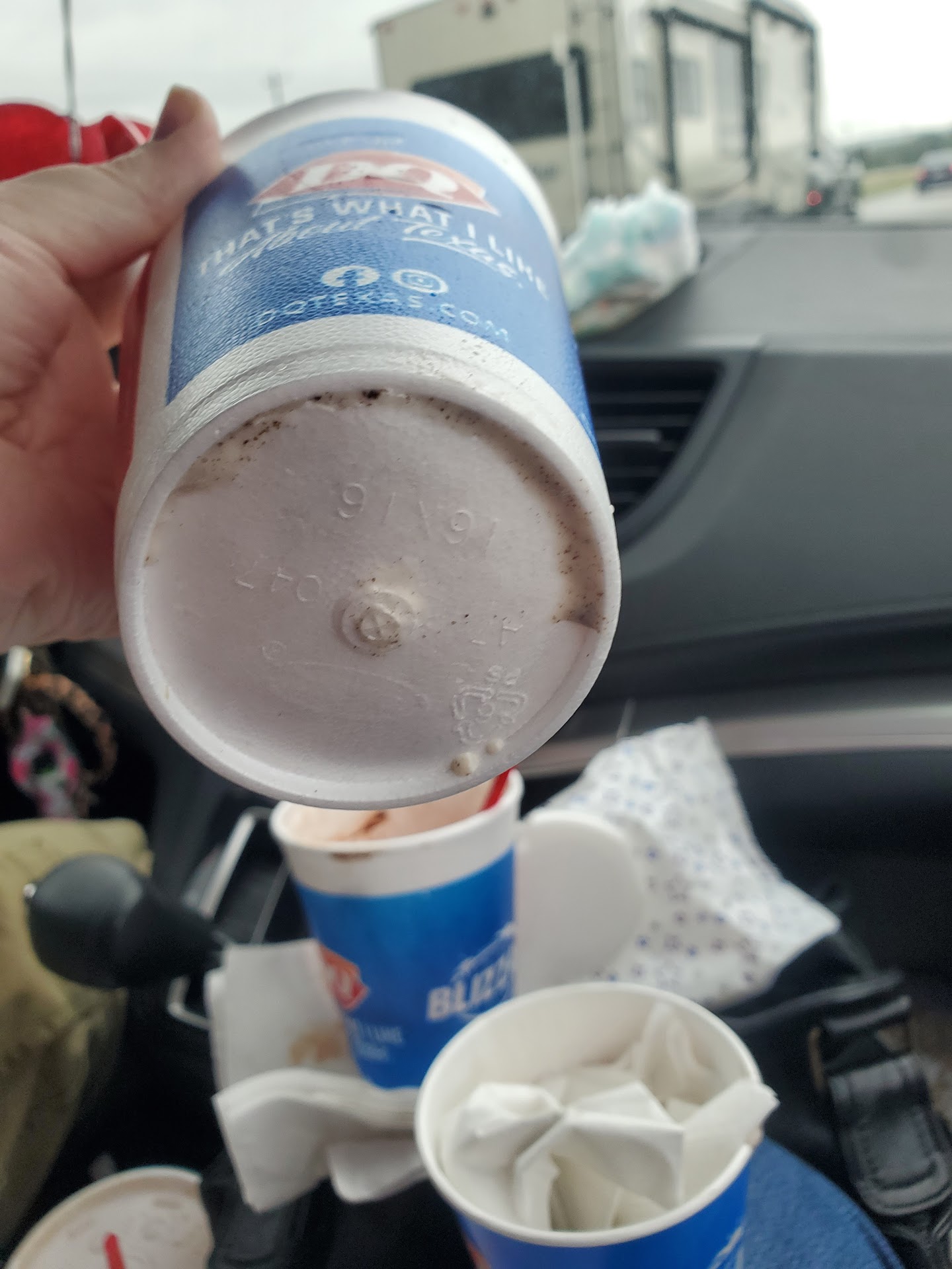 My Husband and I had visited this location earlier today with our little one for lunch. We came back for a blizzard. Once we ordered our blizzards through drive through the lady that took our order had an attitude. She made it out to be a problem when we ordered a blizzard and didn't want one of the items in the blizzard itself. You could hear it in her voice, and even better once you got to the window she had an attitude by the way she looked at you. The way she presented herself. No smile. And said here is your blizzard without the "xyz". It shouldn't matter how you order your meal or dessert everyone is different and likes different things. If everyone liked the same thing we would live a very boring life. I surely hope whatever your going through it gets better but don't take it out on your customers. Better yet if you don't want to work there, clearly it shows and you should find another place of employment that makes you happy. It's not fair to the consumer. Treat others as you would want to be treated. The cherry on top of this whole interaction was husband's blizzard cup was found to be leaking on the bottom half way cut through. The bottom of the cup nearly opened up. Thankfully he was lucky enough to finish it before causing a mess. My blizzard had 5 different holes on the side of the cup like she used her finger nails to press through the cup. The cups are pretty thick so it takes some force to make these piercing holes in the cup. The bottom line of this review is would you personally want someome to deliver your ice-cream of choice the way you did to your customer. I'm sure your answer will be no. Is there no quality control going on to triple check your product before giving it out to the customer. I surely hope you do better. Photos are attached...