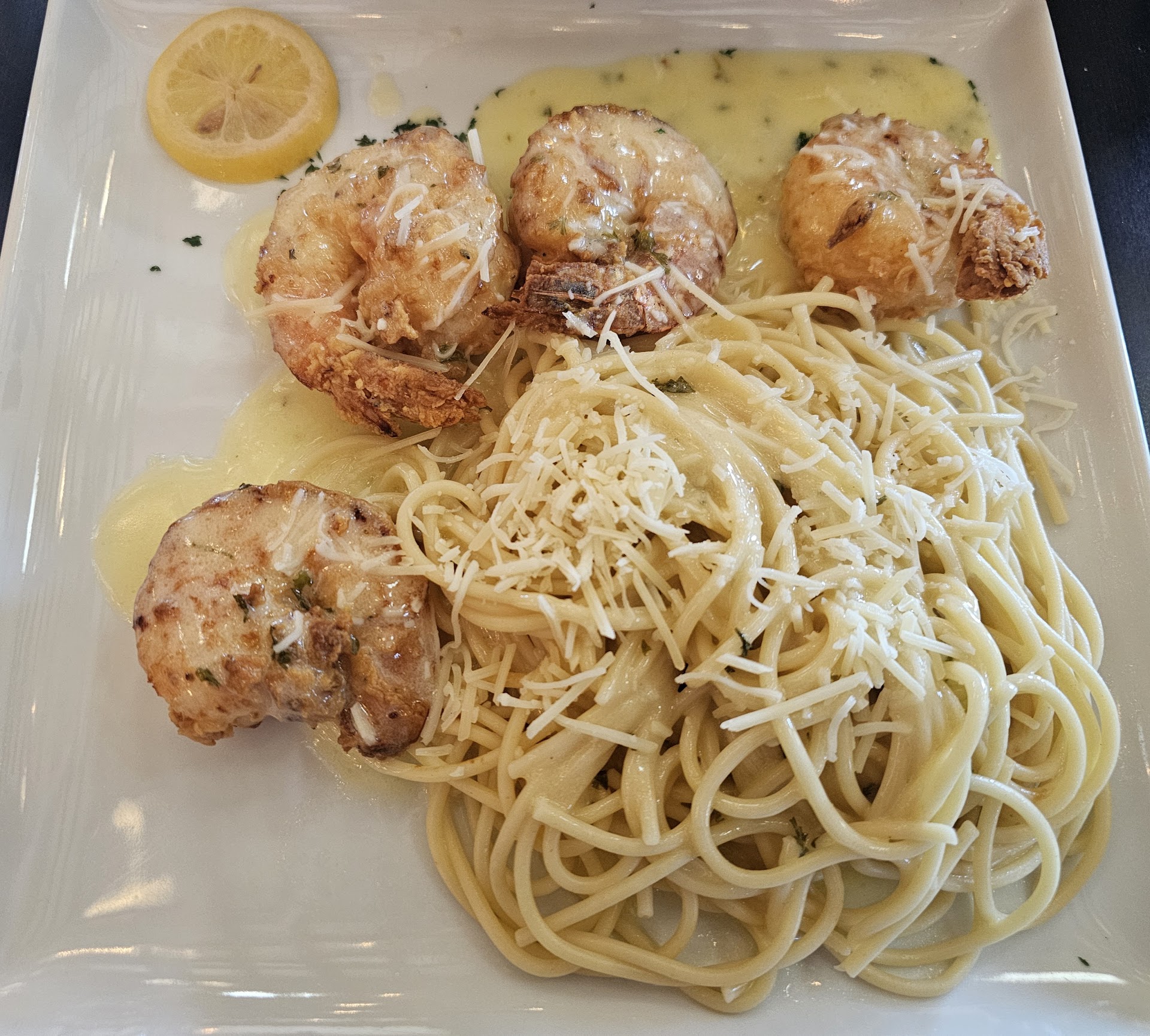 Read more1/2 dozen Blue Point Oysters on the Half Shell, with accompanying fresh lemon and 2 sauces, were great appetizer topping a bed of ice. Oysters were 1-2 bites each, so a nice size. Bistro Shrimp for dinner was excellentâŠ.large, tender shrimp in very tasty lemon butter sauce, 4 to an order. Size of the shrimp and the sauce made 4 quite filling as the entree with the accompanying pasta served to the side. Dessert was Blueberry FlapjackâŠreminiscent of Tres Leche cake, and a strawberry glaze drizzled over with fresh strawberries topping the big slice. Food was freshly prepared and delicious, nicely served and service excellent. We especially enjoyed sitting outside on the deck late afternoon. The Swirl Margaritas were lovely with a slice of fresh lime on the rim. One last thing that we all likedâŠ.a large glass bottle , capped, of cold water and SMALL glasses that you could actually wrap your hand around and serve yourself, were appreciatedâŠ.unlike some restaurants that you need 2 hands to hold the glass. One person in our party of 4 had the Hamburger with Brie and Bacon with waffle FriesâŠ.very good and beef patty cooked perfectly, juicy and delicious. Only open as The Bistro for 2 weeks , and they hit all the right notes for ambience, food, friendly casual service and pleasant outside dining on a late Friday afternoonâŠ4PM till about 5:30. Nice to have all...