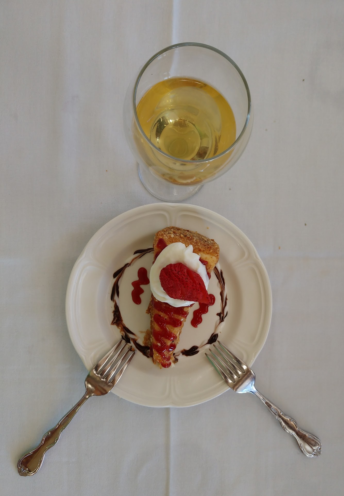 Aside from that, the food was absolutely delicious. Everything had fresh ingredients and all hot food came out as intended: HOT! I was amazed by how much I loved the lemon-herb vinaigrette with my house salad and my mom was equally happy with it on hers. My dad tried the soup of the day and we were pleasantly surprised by the amount of meat in the gumbo. All three of us got the oven-baked chicken with a honey glaze and we were all in awe of how tender the meat was and how well the honey glaze worked with the perfectly made mashed potatoes (creamy, garlicky, and perfectly salted). I kind of regretted substituting the mashed potatoes for the sweet potato fries because of how well the flavors of the chicken and mashed potatoes blended together; however, I was amazed by the amount of fries I had received. Most restaurants are skimpy with sweet potato fries, but not this one! There is no list of desserts on the menu, but our waitress asked, then provided the available options, so my mom ordered the slice of New York cheesecake with the traditional drizzle of raspberry sauce. The dessert wasn't super sweet, so it was the perfect ending to one of the most amazing lunches we've had in awhile.