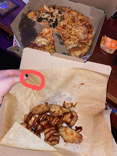 At this point, I called the store. I talked to who I believe was a manager and described our issues. He tried to give us a credit rather than remaking anything, but I insisted the pizza get remade. He put me on hold to check to see if the driver had left yet with the sauce, as if that mattered to us. Turned out the driver had left, so I told him to tell him to come back, as we wanted our food remade. The manager wasn't happy about this for whatever reason --as if it's out fault we got plastic in our pizza and no sauce on the wings. He then argued with me about remaking the wings. I told him there was almost no sauce, and furthermore, we didn't even have any ranch. He reluctantly agreed to remake the entire order, but was extremely rude about it because, again, somehow it's our fault they screwed us.