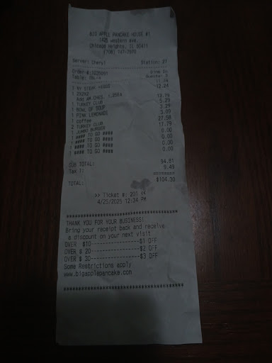 Read moreFirst of all we (my family) have been eating at the Big Apple restaurant for approximately 20yrs(I think it was called the Looking Glass). And always enjoyed the restaurant and food. On July 2nd we had a party of eleven and ate there for the second time in about a month, our waitress was very friendly but forgetful, which was not a problem it was busy there, we all have those kind of days. She forgot my order, forgot I didn't want coffee when my food finally came, forgot my pancakes. Still no problem. The problem came when one of our party ordered a steak medium, not well or medium well (it was well). When this was brought to her attention, she told him that's not what he said (it was, I was sitting next to him). We were then informed by the waitress he'll have to eat it, that they don't re-cook steak and wouldn't. (none of it had been eaten the tip was sliced revealing it was well done). We asked for the manager two other people came before the owner came out. He informed us the same, cause the steak cost him more then he charges for it (we all stopped eating cause that's not true) he was very agitated and offered sausage patties instead of STEAK. When he was told no that's OK he became more agitated and angrily asked well what do you want me to do, again he was told that's OK, he then said just pay for the eggs and hashed browns (that had one fork full missing) like he was doing us a favor, that one meal should have been taken off the bill seeing we were spending over two hundred dollars. He never apologized for their mistakes. We felt disrespected and couldn't wait to get out of there. Hate to say it but we're done with the Big Apple restaurant. This is what happens to a successful business they forgetful who and what made them successful (CUSTOMER...