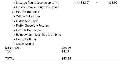 I went ahead and took it home because I ordered this on Nov 24th and needed for Nov 27th bday. So the day of her birthday, I cut open and serve because I have people over. Well the cake doesn't have the right ice cream(cookie dough) and has no middle layer (fudge). I call the store and told her the problem. She took name and number and said manager will call me back. No call. Nothing. Your charging 40 something for. CUSTOM CAKE! which was NOT provided. Huge Disappointment!!!!