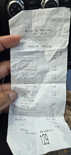 l found this place looking for a late night (after 10PM) non franchise fast food joint. can't find a decent bite to eat or a place with any soul or character in the south burbs after 9 or 10 o'clock. cruising down rt. 30, saw nick's, drive thru open, lobby? I don't like drive thrus, no soul. yes! lobby open. menus displayed typical greasy spoon fast food: burgers in many varieties, hot dogs, sausages, chicken, pizza, gyros and a rib eye steak sandwich, hard to find these days as one owner told me beef is just too damn expensive. usual cast of characters stumbling around; bored but efficient window girl, cook with white? apron and hat, and the show runner walking around in street clothes in the back, paying a lot of attention to the front (can't be too careful at 11:45 PM?) and another customer waiting for his order pacing around talking too loud on his cellphone. I went with the rib eye steak sandwich, $11.00 but big and tasty and they made it the way i wanted it, lettuce/tomato/pickle/mayo, a hot dog, and a filet of fish. order came fast enough for fast food, taste and quality well within fast food standards. sign inside says lobby 'til 12MN, drive thru ' til 1A, rare in...
