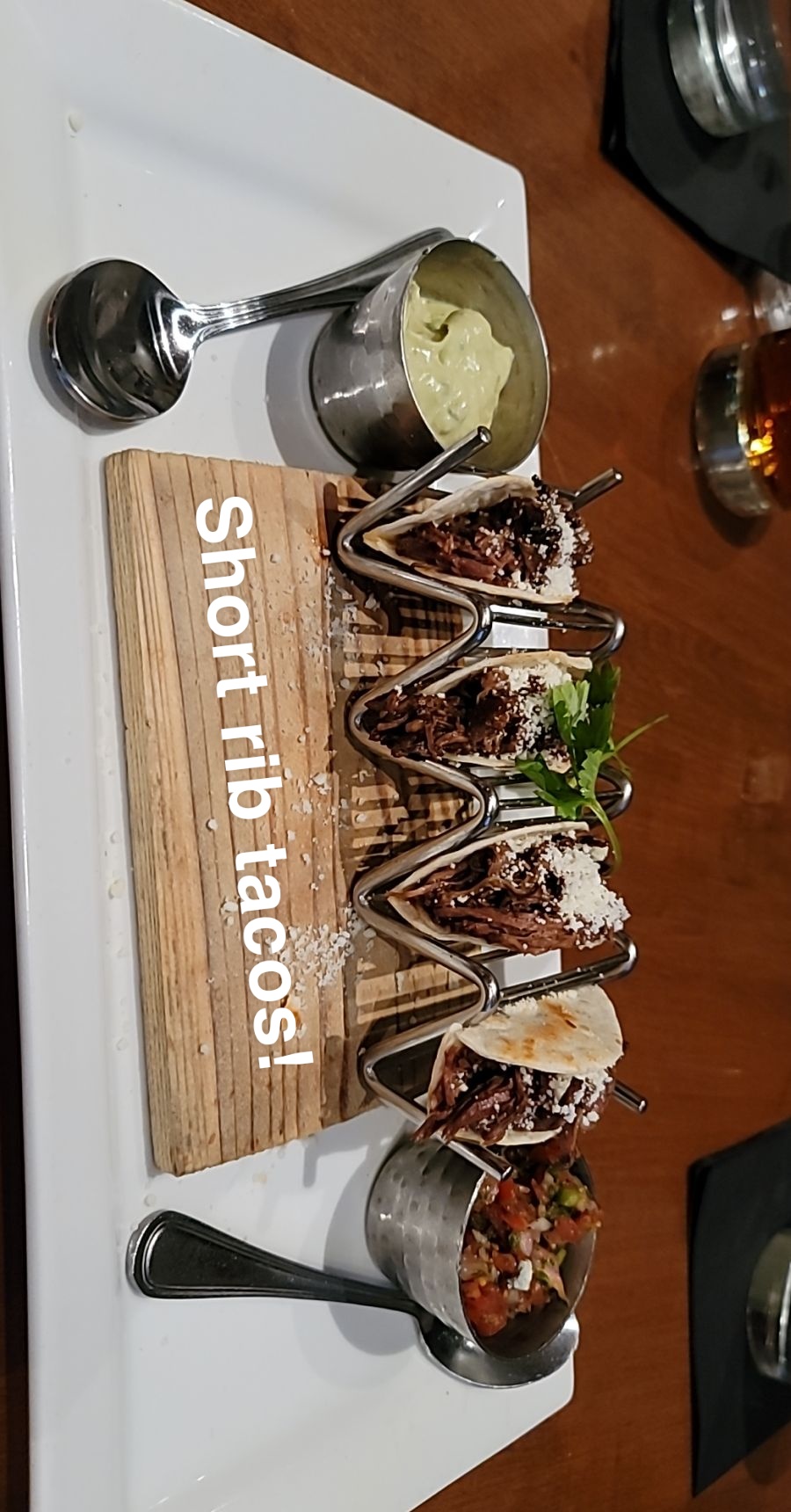 We were served drinks right away by our waitress, Stephanie who was so prompt, friendly, and accommodating all evening. Ordered the calamari and 2 orders of the short rib tacos which were great. The bread (or biscuits) were amazing and we don’t typically eat the bread at restaurants, but this was worth it! We were with friends who had eaten there before and said the specials were typically great. Last night was a shrimp fettuccine and a honey mustard char dish.