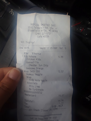 Read moreAmazing store that is very considerate of the customer!!! I realized an employee made my smoothie with sugar on accident when I asked for no added sugar. Were only human, no big deal, but I let them know they made it wrong and asked for a remake and the young man working the microphone refused and told me I was wrong. I come 4-5 days a week and was disappointed because T.S.C. has always been great with customer service. Went in today to talk to a manager during my lunch break. They were very busy but the manager as quickly as she could came over to talk to me, heard me out, was disappointed with her staff member and let me know she would have a talk with the individual after the lunch rush and that T.S.C. would never approve of that behavior. She personally made another smoothie for me, and gave me 2 coupons for a free smoothie. If you have a bad experience I promise it is way outside of the normal and even if you have a bad experience, raise your concern and they will make sure your voice is heard. That manager deserves a raise and then some, was polite and professional and very considerate. Final update, employee was at windows a few days later, apologized and had a nice short conversation with him. My respect goes out to that young man for owning his...