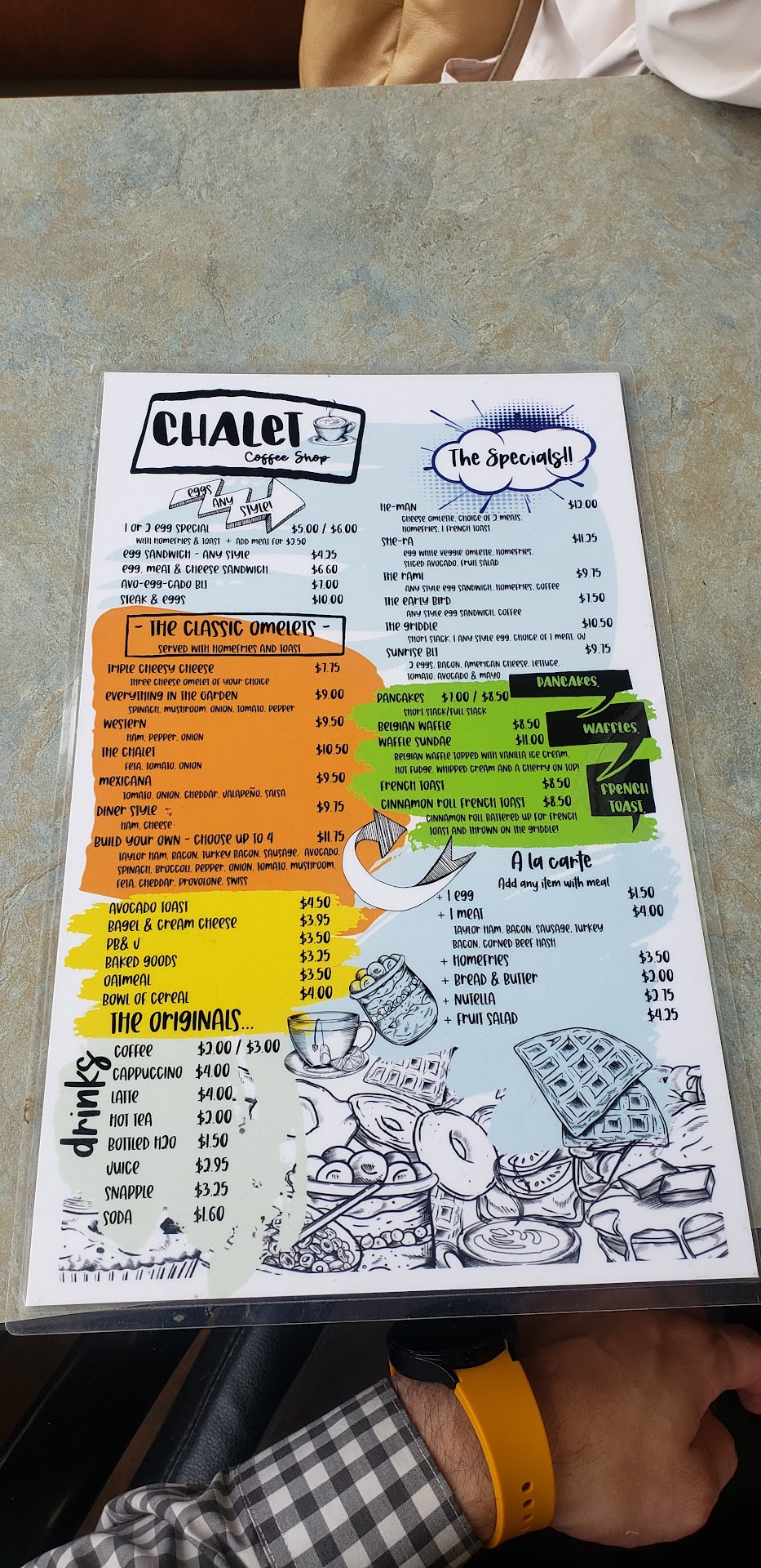 The Chalet Coffee Shop has a hometown feel, it's the pulse of the community when you visit Bloomfield; It's what made this town feel like home to me. Rami, the chef and owner takes pride in his establishment, and he should- it's clean, tasteful interior, excellent service and fantastic food are what you get when you visit.