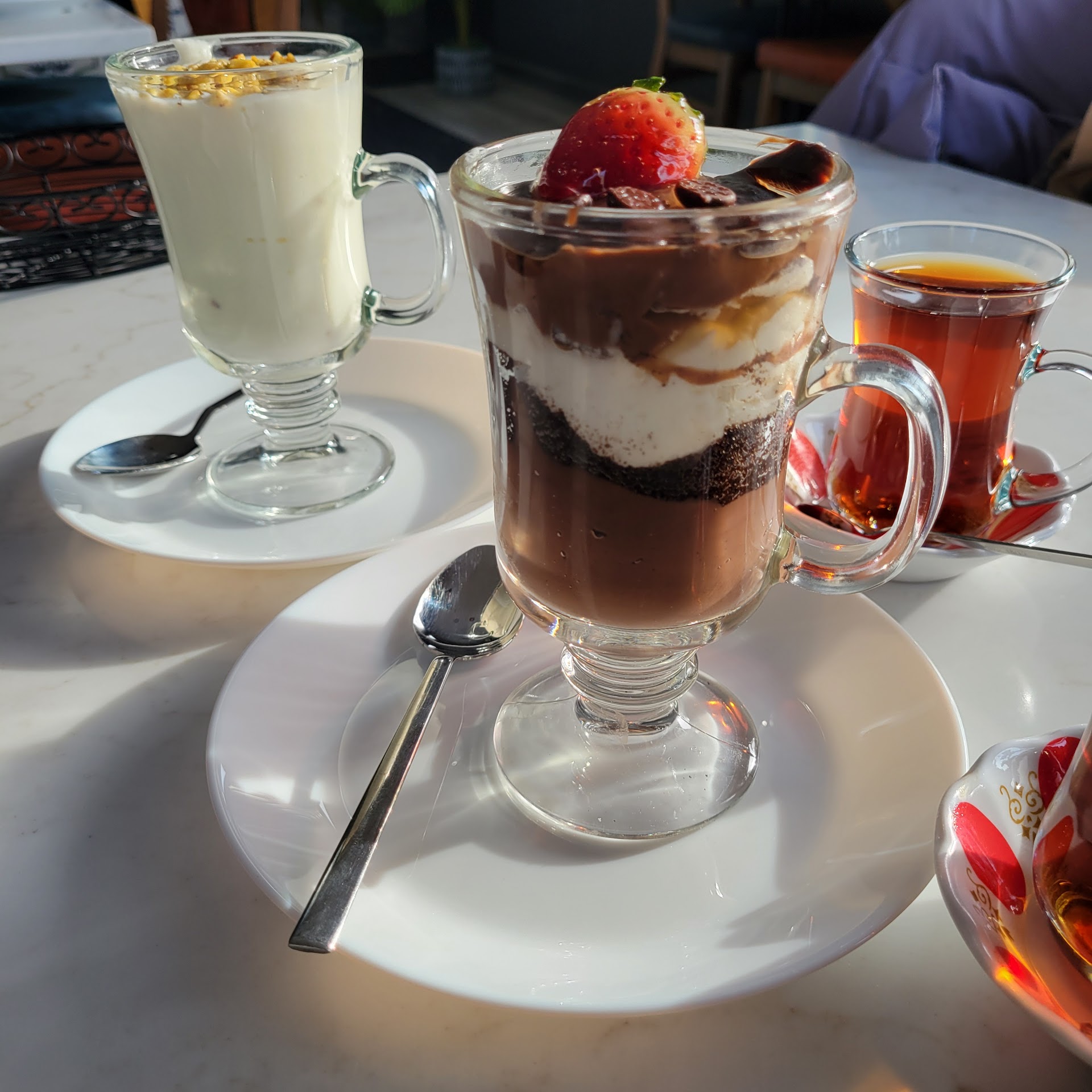 We were going to split a homemade Rice Pudding, but before we could order, one of the owners had provided two complimentary desserts for us to sample along with Turkish Tea. The Almond Silk with crushed toasted Pistachios was perfection.... light and not overly sweet. The Chocolate Pudding Parfait was richly decadent! Neither had a drop left... they were THAT good!