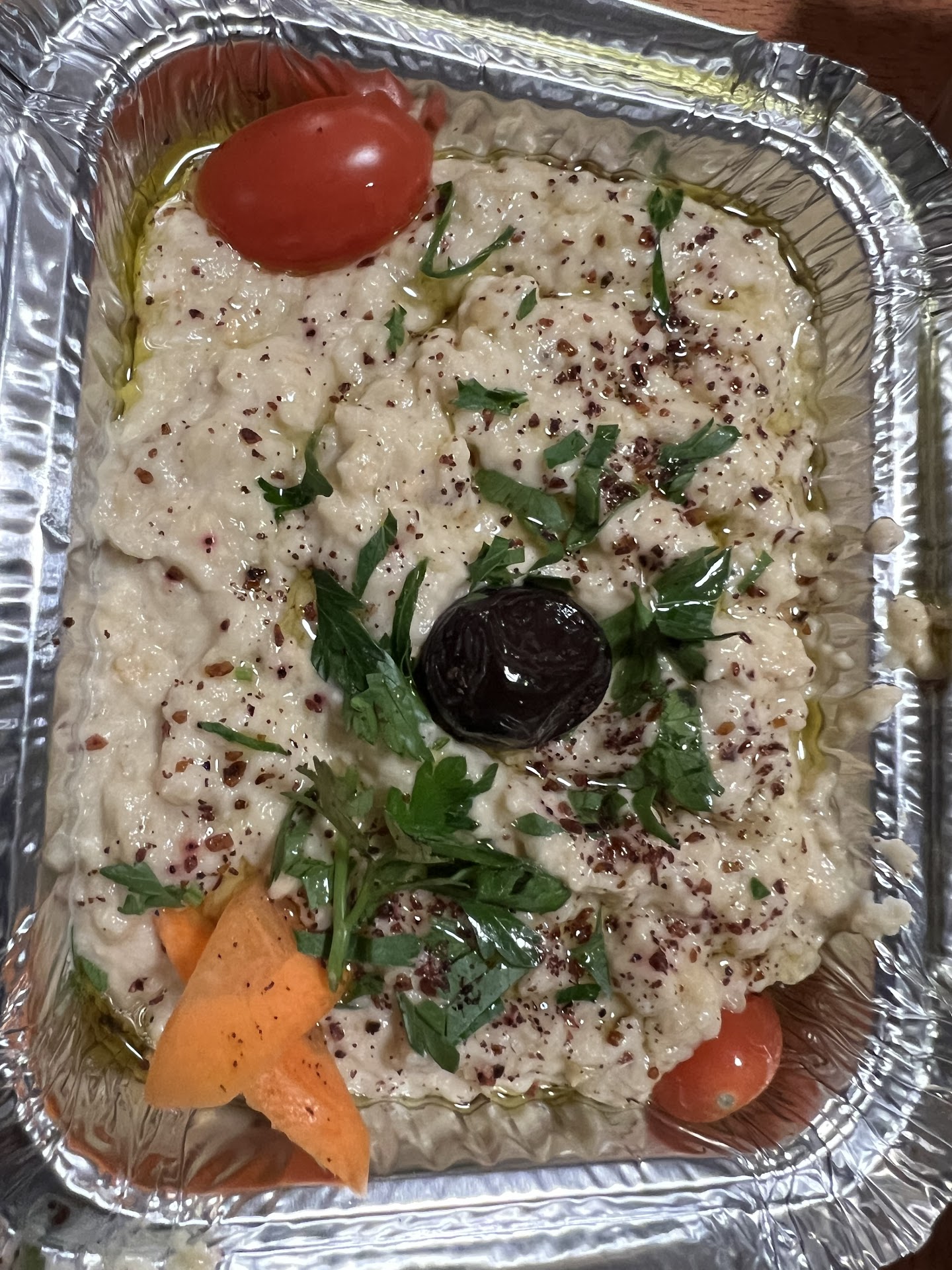 My kitchen is under construction, but I feel so lucky this evening to be enjoying a take out feast of light and springy calamari, that perfectly charred and smoky Baba Ganoush again, salad, and another gift of a Turkish dessert.