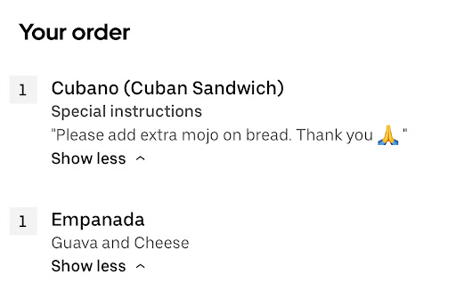 Read moreDissatified!! Ordered through Uber Eats, first the price is ridiculous. $2.50 for a mini empanada that wasn't even fresh and cold, the outside shell was rubbery. Ordered the Ropa Vieja with white rice, beans and maduros...$15.95 the taste was just okay but the maduros were so hard and stale, the beans also taste like they had burned in the pot. The food was also room temperature. If you are going to charge high prices for this basic food at least have it freshly made not hours before sitting under a lamp. I get that these type of places have buffet style so the rice and meats are made early but something like empandas and maduros etc needs to be made/fried at the time of the order. Definitely not worth the money. This was a big waste. I won't order from Havana...