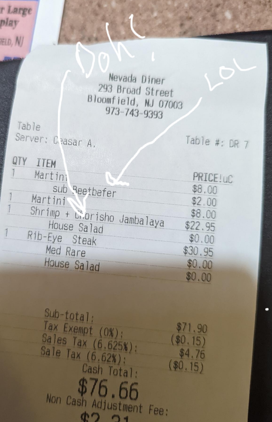 We tried the Nevada Diner on a Saturday evening when we couldn't get a walk-in seat at out first choice, the Bloomfield Steakhouse. The Nevada dinner menu had both steak and seafood, and they have a liquor license! We ordered ribeye, jambalaya, salad, and martinis. We hoped it could work out. It didn't! But it wasn't a total disaster.