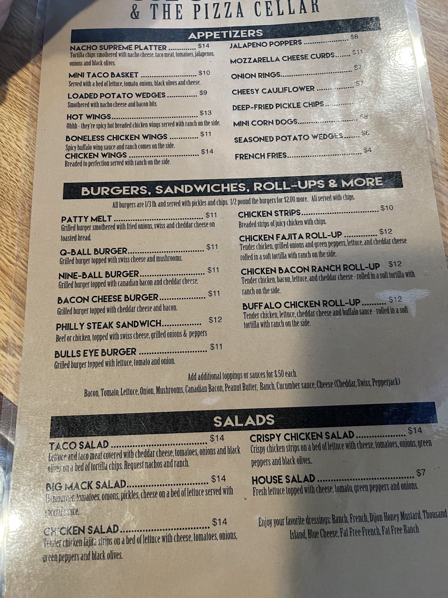 My kids and I had been really wanting to try The Pizza Cellar after stumbling upon it on Facebook. I called and asked how late they were open as we live 15 minutes away. The lady on the phone told me until 9:00pm and then it's just pizza and fried food. I asked about specials and told her we were coming! We got there at 8:30pm. The restaurant doors were already locked so we walked around to the bar doors. We figured they were slow, we grabbed a table and the waiter came over. We asked for menus and he said they were only serving pizza and fried food. I told him that we had just called and were told they were open until 9. He said they already cleaned the grill, I said we drove 15 minutes here because I was told you were open. He said OK and stormed off snapping his fingers with attitude. We walked out and drove 30 minutes to Austin and ate at Perkins! I would of loved to spend my money at a mom and pop restaurant, but unfortunately we will...