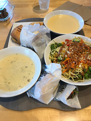 Read moreAmazing food! Try 2 combo is prefect - pick from a whole ciabatte bread sandwich, half soup, or half salad. If you are doing a single item, soups are cheaper. Mostly everything is made fresh in house. Walk-in and they greet you with their paper menu. Wish they had hand sanitizer available or sample soups while you wait in their typically busy line. You order your sandwich and salad at the first counter then slide over to the soups which you can taste. This typically holds up the line with everyone wanting to try their 10 different soups. My favorite is the Roasted Red Pepper & Lobster!!! I'm not to excited about their cold piece of bread they give you with the soup, wish they would warm it up. Plus soup toppings are extra like croutons; they put them right in the soup which get soggy by the time you start eating your soup. After picking your soup, you can choose one of their amazing looking deserts but their free chocolate covered strawberry it's usually enough for me. Remember what you ordered because you'll need to let them know by the register so they can gather it on your tray and charge you. I highly recommend you try one of their drink infusions, my absolute favorite is the strawberry\orange......wow!!!!!! Seating is extremely tight, chairs are noisy, just moving them a tad. They have USB and wall outlets available at the high chair bar style seating by the bathrooms. They also have window blinds in case the sun blazes on your table (can't believe some places don't have this on their windows). Also leave your tray on the table, they will swing by and pick it up. Overall I eat here often, on my own, with my family (includes 2 little ones), and with friends. I highly...