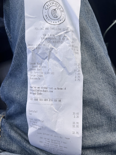 Read moreThe Chipotle in Bloomingdale on Army Trail Rd is possibly the worst one I've been to- next time I'll take the drive to a different one The line was practically out the door at 7pm- I finally get up to the counter and I ordered my bowl and a quesadilla, only to b told that I can only order a quesadilla online- there is literally nothing saying that anywhere in the store- this is the only thing my child will eat from here- had I known this I would have left and not waited in that horrendously long line- I would have just gotten us both a sandwich from popeyes- it would have been much cheaper- I was tired because I just finished an almost 12 hour shift and I didn't really feel like going to a 2nd restaurant- I asked y it can only b ordered online amd I was told because the machine that makes the quesadillas is in the back- makes no sense to me- go in the back and make the dang quesadilla- just a word of advice- maybe put something next to quesadilla on your menu board that it can ONLY b ordered online- this is the first and only Chipotle that I've been to where I could not order a quesadilla for my daughter This particular Chipotle is very close to where I live but I will go out of my way to go to a different one Also, the guy putting the bowls together is very chinsie with the ingredients- I had to ask for more fajita veggies because he literally put on like 3 onions and 1 1/2 peppers, had to ask for more cheese because he put on like 5 pcs of shredded cheese and had to ask for more lettuce cuz he put on like 6 pcs of lettuce- for what I'm paying for a bowl, all those ingredients better b overflowing in my bowl- c'mon bloomingdale...