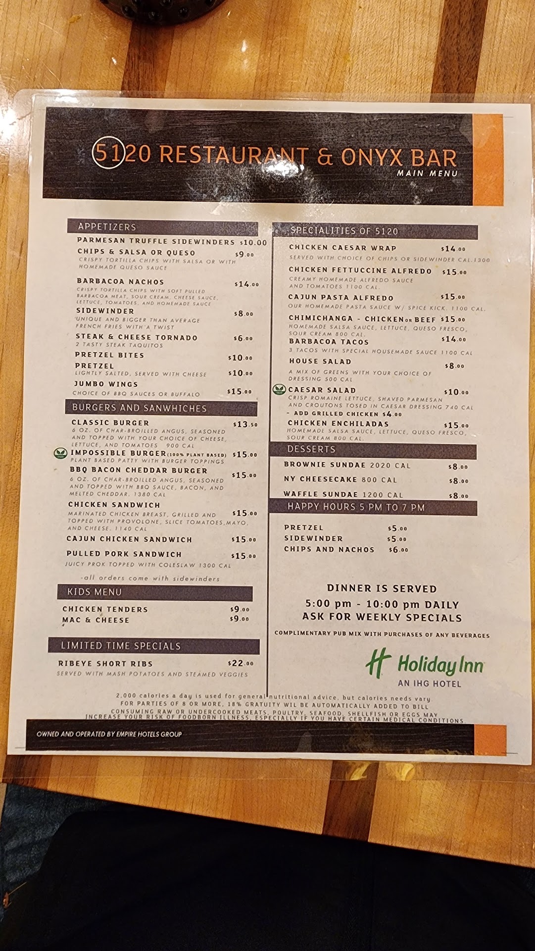 Second time here, I believe in second chances-but never again. Positive- good wings. “House specialties” were food service level B. Only bartender working, so hard to get her attention at our high top. Couldn’t charge to room, “the program isn’t working.” Good beer on tap, but white wine was WARM. The worst was the atmosphere-it was awful for both our stays (2years apart) as it is an open concept area to a “game room” with pool table and foosball- and space to eat or lounge on sofas and relax with a drink. Both of our visits here were plagued by screaming during meals, not an exaggeration. I taught for 40 years, these were playground type ear shattering screams indoors, kids throwing pool balls and running, in an open area adjacent to a bar meant for relaxing. Both times our meals were spoiled by children not being controlled in bar/lounge area- breakfast was noisy, also. So much for relaxing after...