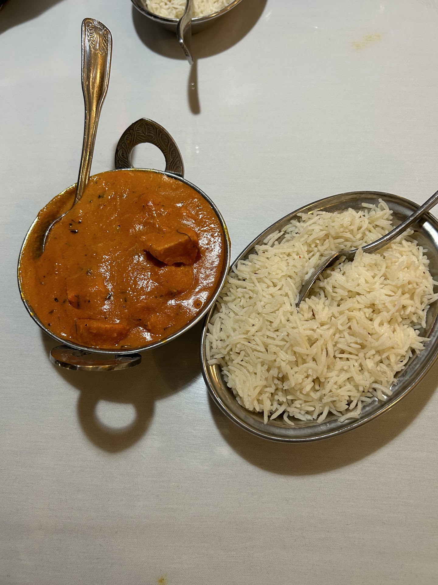 First the positive: Prices were OK -- we paid about $26 for the vegetarian appetizer platter ($7.99), one "entrée" (as we Americans oddly call the main course) -- lamb & shrimp curry for $12.99, one Kashmiri naan ($3.99), and one sweet lassi.