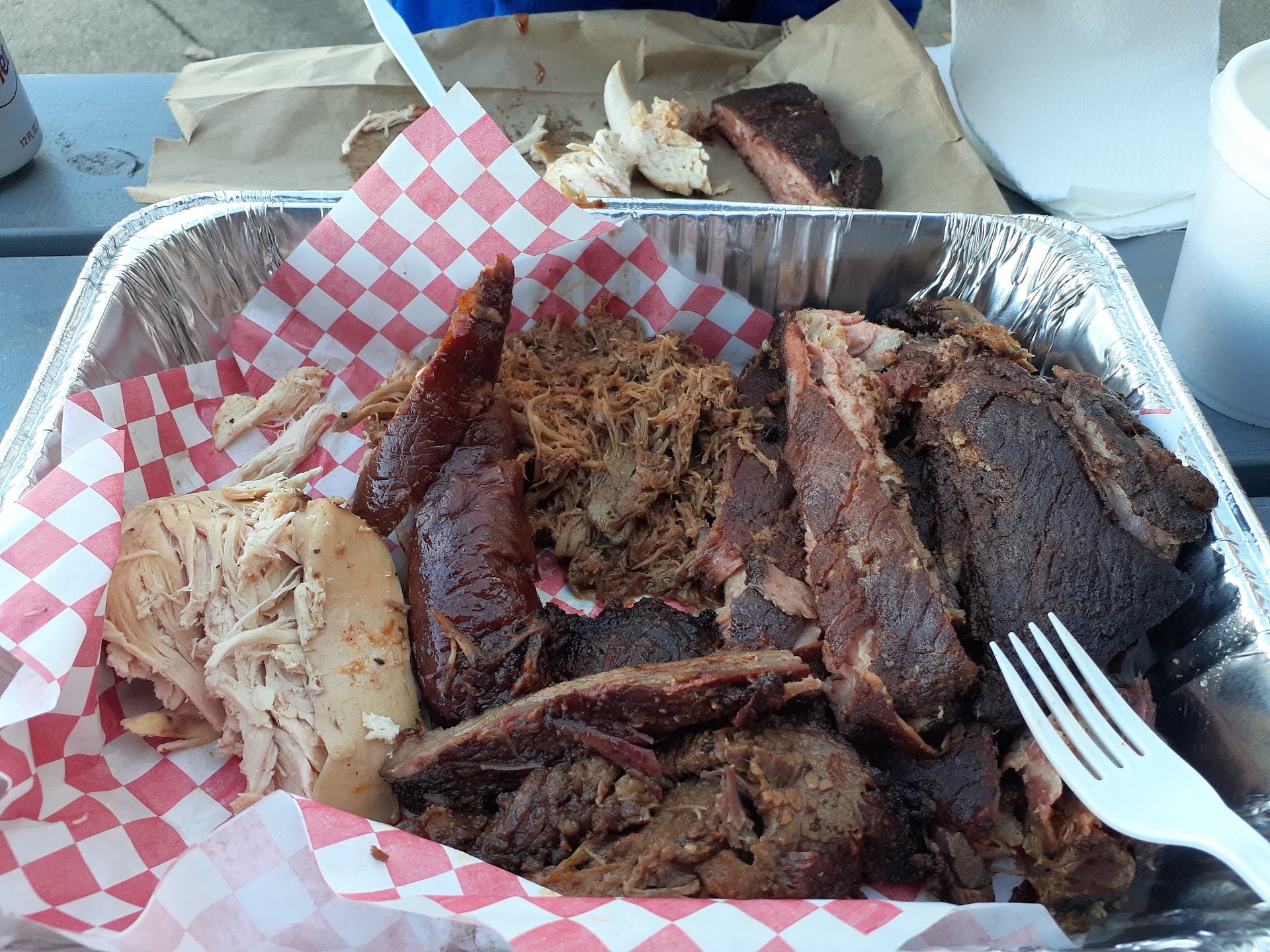 The Brisket was very well smoked if a bit salty but I am fine with that. I thought it was brined first but was assured it was not. The chicken, pulled pork and ribs were all great as well with good smoke. The spicy sausage was really good. Too much for my wife but not insane to me but a very nice spice bite.