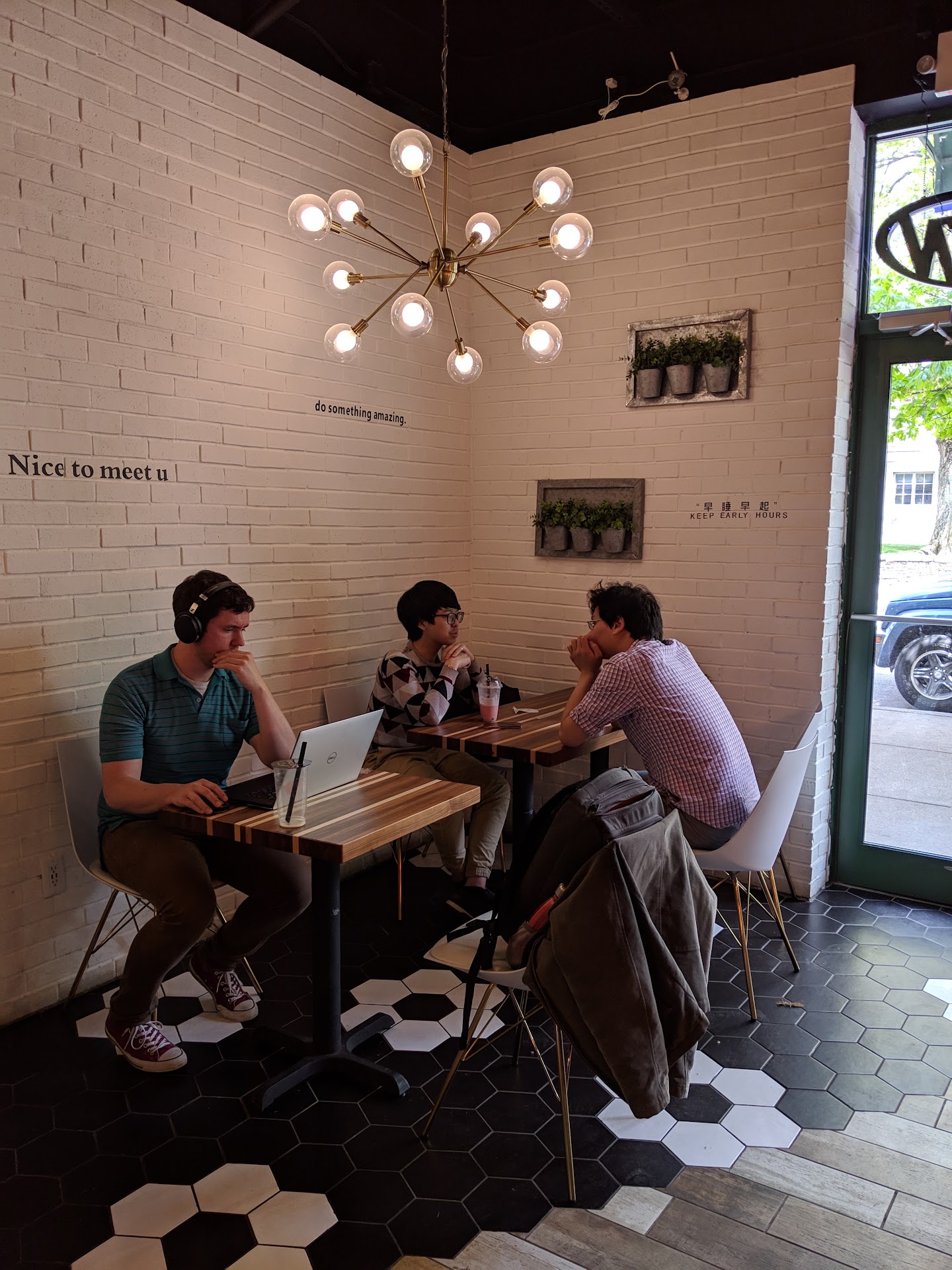 The food and bubble tea was good but the overall experience was a little weird. I ordered an all cheese corn dog and a Thai green milk tea with honey boba. Maybe 5 minutes after I ordered and paid, a different staff member (I think an owner) called me back to the counter to tell me that their menu board was outdated and they didn't have Thai green anymore, and offered to make a different drink. So I ordered an oolong milk tea instead. They have non-dairy milk alternatives available (oat, almond, soy). The corn dog was ready 10-15 minutes after I ordered which was okay, but the tea took almost 25 minutes. Someone came in after me and ordered a honeydew milk tea and that was ready for them in just a few minutes, so I think the issue with mine was that they had to brew the tea. The tea was good - it IS evidently actual brewed tea, not powder. It wasn't too sweet, but the drink had some sweetness from the honey boba, which was cooked well. I also liked the cheese corn dog - it was like a big mozzarella stick, very crispy-crunchy with a gooey inside, but surprisingly not too messy. Prices are reasonable enough. The shop was cute and the tables with cozy with lots of pillows. I felt a little awkward because for a while, I was the only customer in there while the presumed owner was doing interviews. The owner and the other barista there were both friendly enough though. I liked the food/drink and I'm assuming the weird stuff is just...