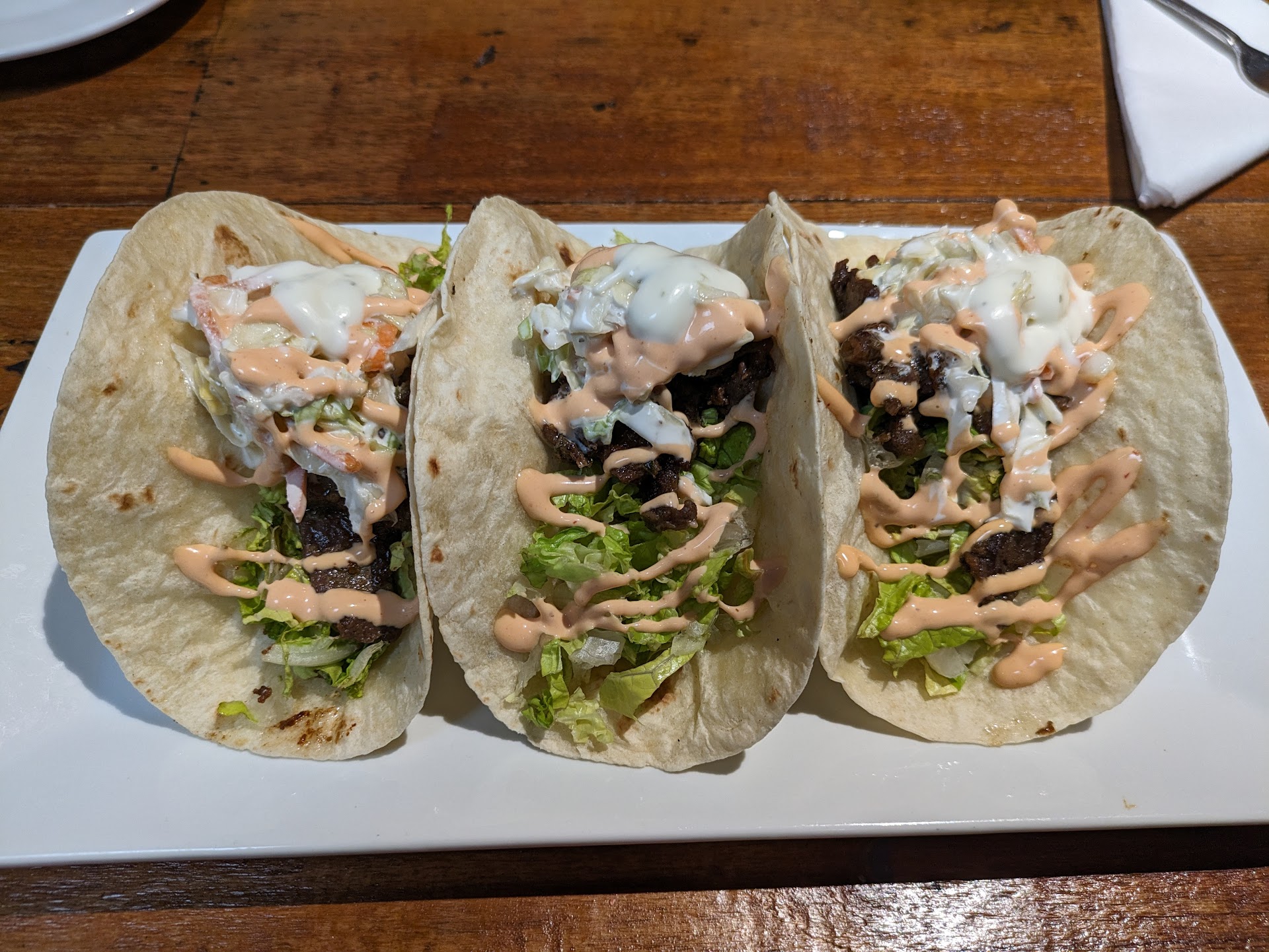 The steak tacos were very nice as well. Plenty of fixings including iceberg lettuce, spicy mayo, slaw and ample ribeye slices this taco was finished with a soft tortilla shell. The serving comes with three and was quite good. This mash up of tacos and Korean BBQ was a perfect match. Light flavorful and generous portions. Again, this one is a keeper.