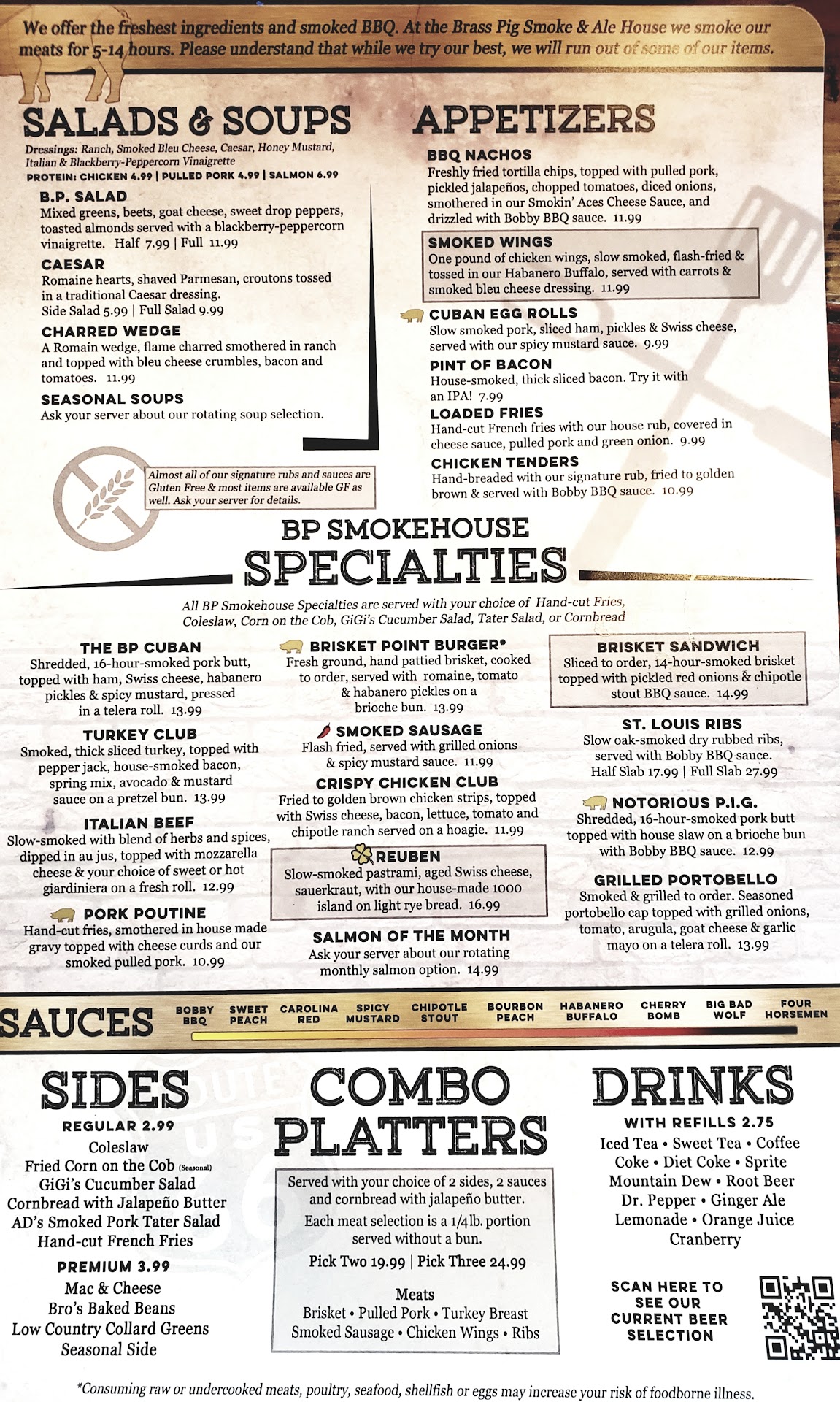 The items we've tried are: Smoked Beef Ribs Turkey Club Notorious P.I.G. Brisket Point Burger Smoked Sausage BP Cuban Chicken Tenders Coleslaw Fried Corn on the Cob BBQ Mac n Cheese Gi Gi's Cucumber & Onion AD's Smoked Pork Tater Salad