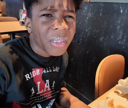 Brayden came back out from his circle of buddies again, and noticed we had now been sitting for about an hour with no food in front of us, completely unaware that they had brought out my and my sons food (our food alone- not my husbands) and it was wrong. He ran back to the kitchen and then brought me and my son’s flats only, and just looked at the empty space in front of my husband. Then he asked for his order again. My husband reordered, and my son and I were done eating by the time his food came out.
