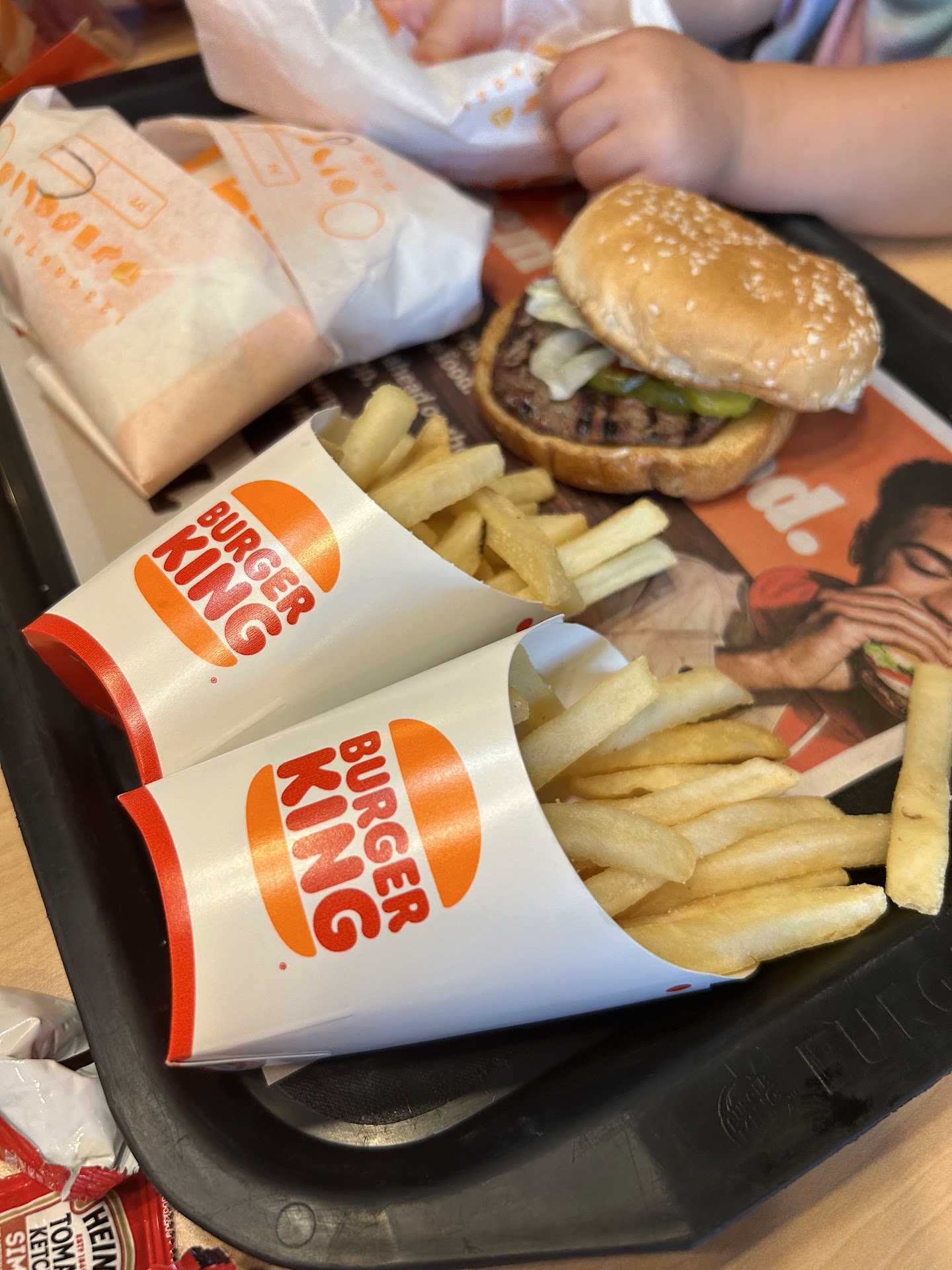 Read moreI have been to this location countless times so, this review is based solely on my most recent visit this past week. We stopped in to grab take-out in the early evening. We decided to order inside as the line for the drive-thru was quite long. The restaurant was quiet inside with only a few other diners. We were greeted quickly and placed our order. The lady who helped us [not sure if she's an associate or manager but, she has been there for a very long time!] was friendly, as she always is. We only waited a few minutes for our order and were on our way. We ordered Impossible Whoppers and french fries. The sandwiches were well put-together with fresh and plentiful toppings and the fries were hot and crisp. We've rarely [hey! it's fast-casual food...things happen!] had any issues with our food from here though. Service is typically very good, as well. The reason for four stars versus five is the interior decor of the restaurant. It is VERY outdated. It could absolutely use a full overhaul. This is not the fault of the staff, nor does it effect the service/quality of the food but, it does effect the customer's perception when inside. This is a busy location with a large high school just across the way and other stores adjacent. Hopefully the owner has some remodel plans in the near future. As I said, we come here often and don't see that changing. Huge shout-out to Burger King for offering some form of a veggie burger option for over TWO DECADES now! We vegetarians will always be loyal to you for...