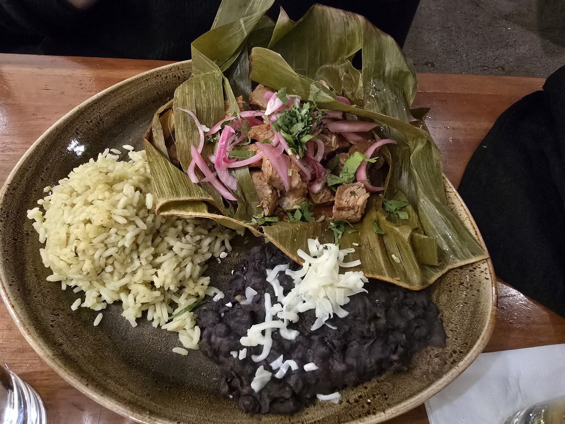 We jumped right into entrees. I got the fajitas (On a bed of caramelized onion and bell peppers. Garnished with roasted red pepper and cilantro. Served with guacamole, sour cream, pico de gallo, rice, beans and fresh flour tortillas). More specifically the off-menu mega combination of the steak, chicken, and AND shrimp. I asked, and they delivered. I got some shrimp.