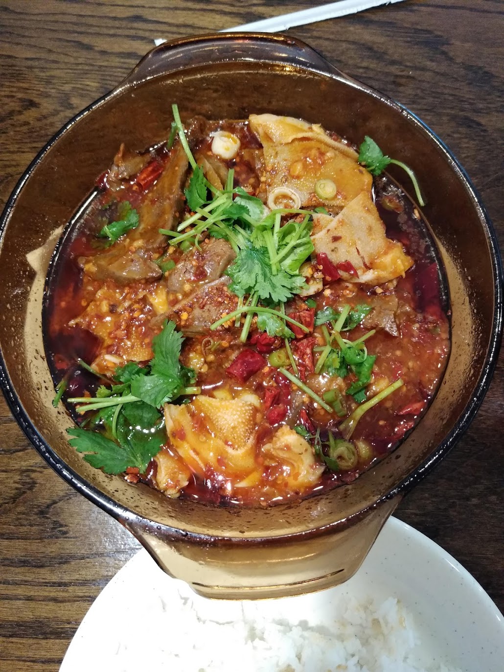 The two that I loved the most are pictured below (rice not pictured). 水煮三样 ("Water Cooked" beef shank, tongue, tripe) Don't mind the English translation which doesn't do this justice. The shank and tongue was extremely tender and flavorful. The tripe had the perfect springiness when you bite. And after you've had the main components, there is some stewed cabbage beneath to round things off. If you enjoy spicy food, I think you should try this.
