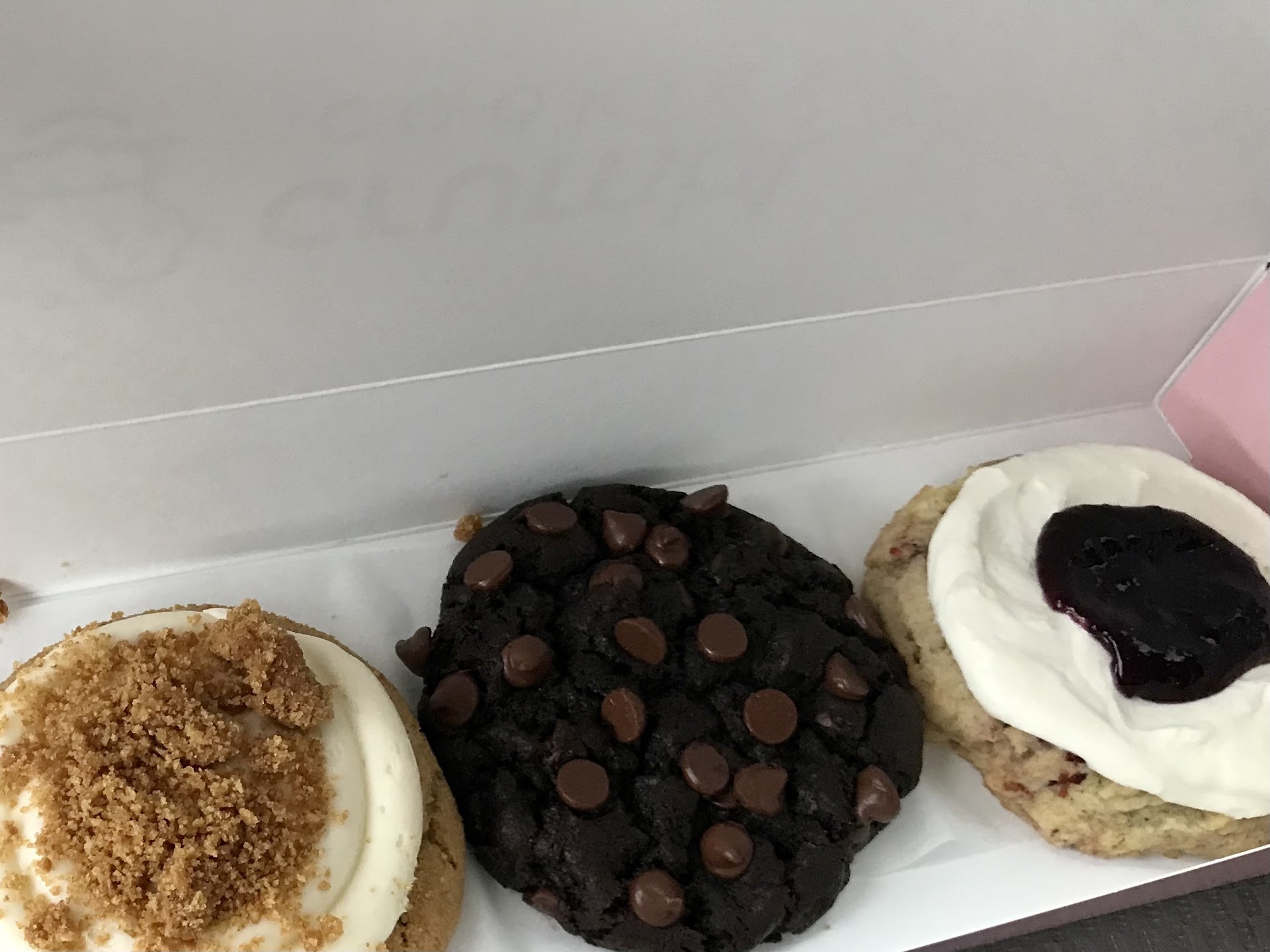 Read moreLarger than my hand ( one cookie). So be prepared. It is a good one to share like a pie. We picked up the four cookies of the day. They had two other but not really interested in a waffle cookie. The other cookie had pink icing. Not sure what it was made of. I have to say the berry cookie was the best cookie I have ever had. The white stuff was whipped cream so not as sugary as it looked. I was afraid it would be icing but it was not. The berry stuff was black berry goodness. Not sweet like jam. The cookie was like an uncooked oatmeal cookie. I couldn't eat anymore but my daughter loved her corner of the chocolate chip cookie. The husband loved his cookie and teen boy was super happy and wanted more. The cookies are pricey. But one spends more on coffee. They are unique and a company only in Indiana. The way you pay is by card. No other way. You order on the computer screen provided or your phone. Not so personal or any talking with the employees. Except when they call your name to get your cookies in a pretty pink box. A new way. They offer ice...