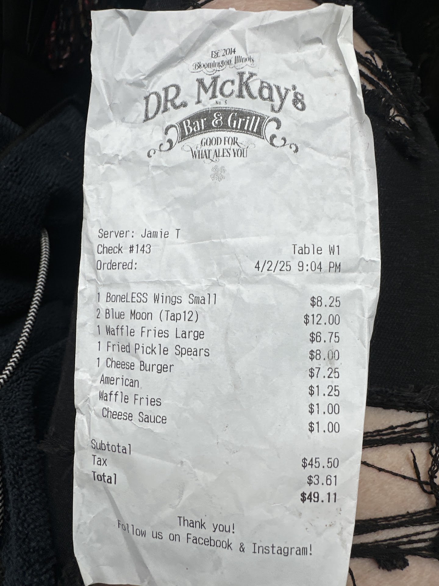 Read moreWe got off work early, checked online for a place serving food after 9:00 pm and DR. McKay’s was listed. We chose our seats and the waitress came over promptly with menus and took our drink order and left before we could say we knew what we wanted to eat. We waited patiently for her to return and noticed she was busy watching videos on her phone and chatting with a guy sitting at the end of the bar. My husband said we will give her another minute and we are leaving . She must have remembered she was a waitress and had patrons because one of them came up to the bar to get a refill, so she got up and we thought she was coming over to us but instead she went and printed receipts for other patrons that she had forgotten about. When she was done she did make her way over to us and we placed our order and hoped that was the end of the terrible service. We noticed that her and the guy both got up from the end of the bar and went outside. Fortunately for the patrons at the table next to us, the bar tender came over to check to see if anyone needed anything. When the waitress came back in from outside, she immediately went to her seat and checked her phone. To say the service was absolutely horrific is definitely true. The food was delicious. Her attention to customer service was reflected in the $2 tip she received. If you’re the owner or manager of this establishment I would think again about keeping Jamie T on staff!!!! I’ve included...