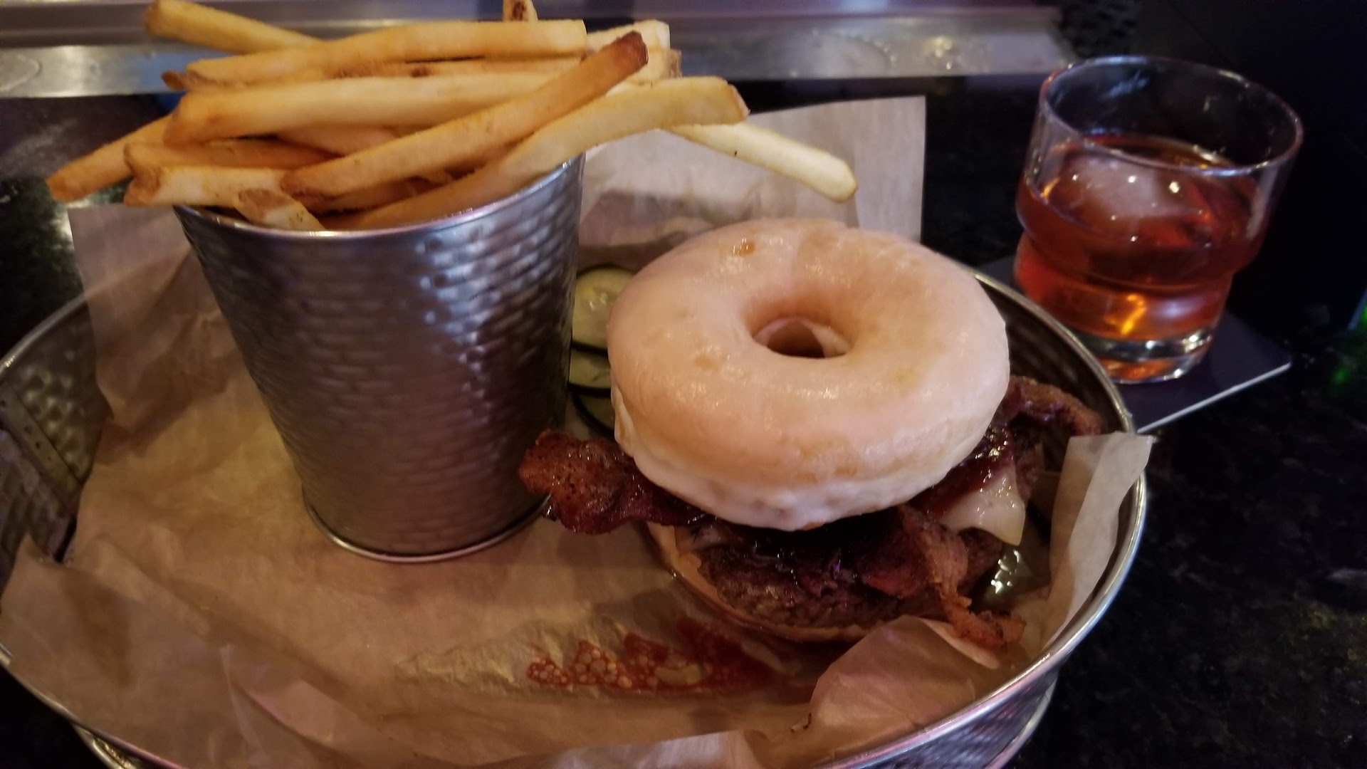 As for the food, I ordered the Donut Burger. It was fine, but there wasn't really anything special about it. Since there were two full donuts for the the top and bottom of the burger, it was too big to eat with my hands, so I essentially had to deconstruct it and eat each piece separately. Plus, it said it came with a spicy raspberry sauce, but I didn't taste raspberry at all. Regardless, there wasn't the level of flavor I was expecting for a nearly $17 burger, and I ended up regretting having ordered it. Also, no ketchup or other condiments were offered for the fries, and the bartenders were too busy to even try and stop them to ask. Had they stopped to ask how the meal was, I would've been able to request ketchup at that point. Lastly, I ordered their Cherry Old Fashioned. I really like Old Fashioneds, and I was looking forward this one. They warned me that this one would be 'very sweet', but it was no sweeter than any other Old Fashioned I've had before. In fact, there was no stronger cherry flavor at all, and they didn't add any garnishments like cherries or orange peel. If you order a Cherry Old Fashioned, you expect to see and taste cherries in your drink, especially for an $11 drink.