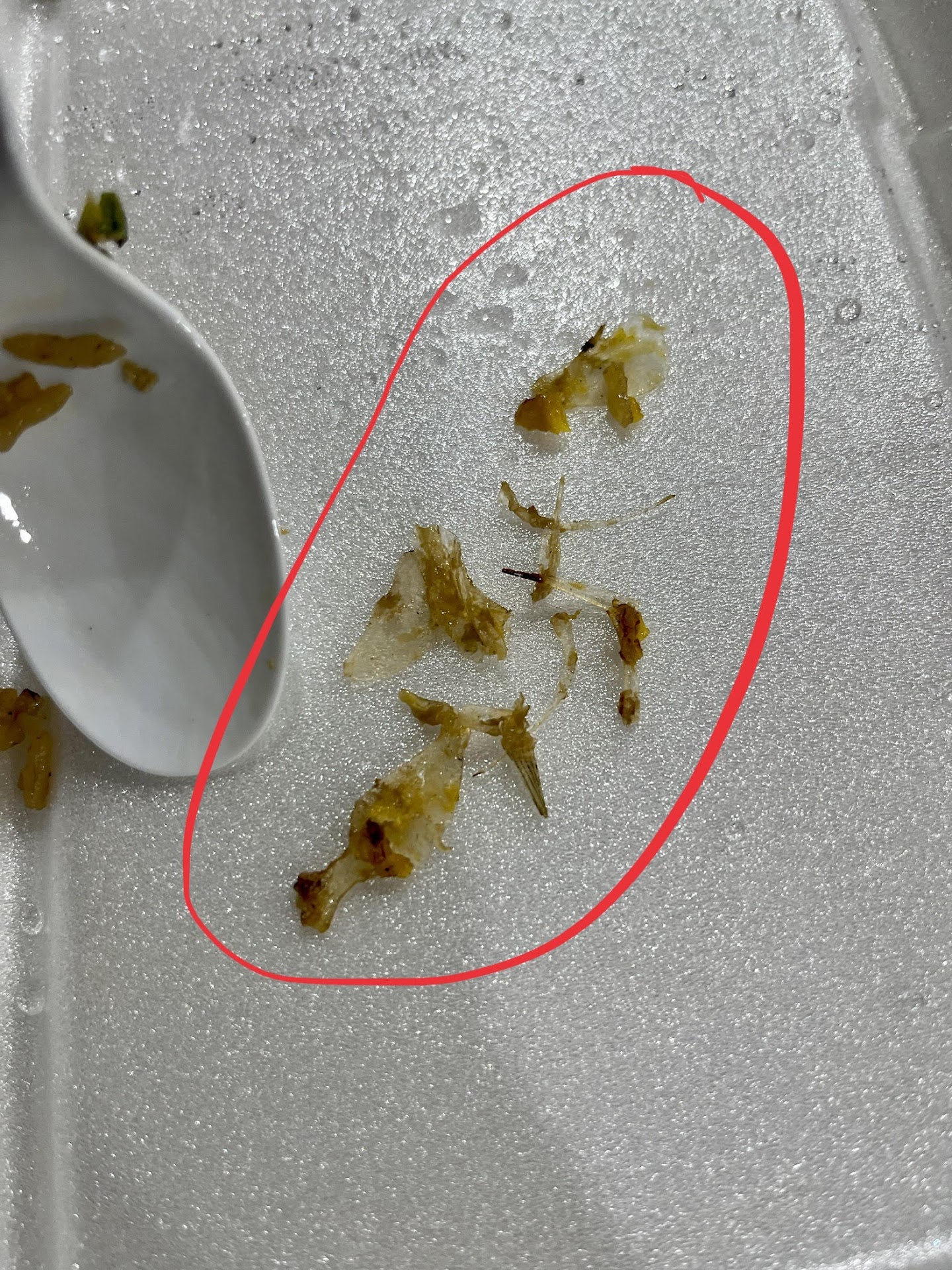 At first, I thought one of the plastic shards was just a shrimp shell accidentally mixed in. Unfortunately, they were sharp pieces of broken plastic. It would be understandable if it happened by accident in one dish (accidents happen), but the shards were present in all three dishes. The pieces were sharp and small enough to get lodged in someone's throat and do some damage.