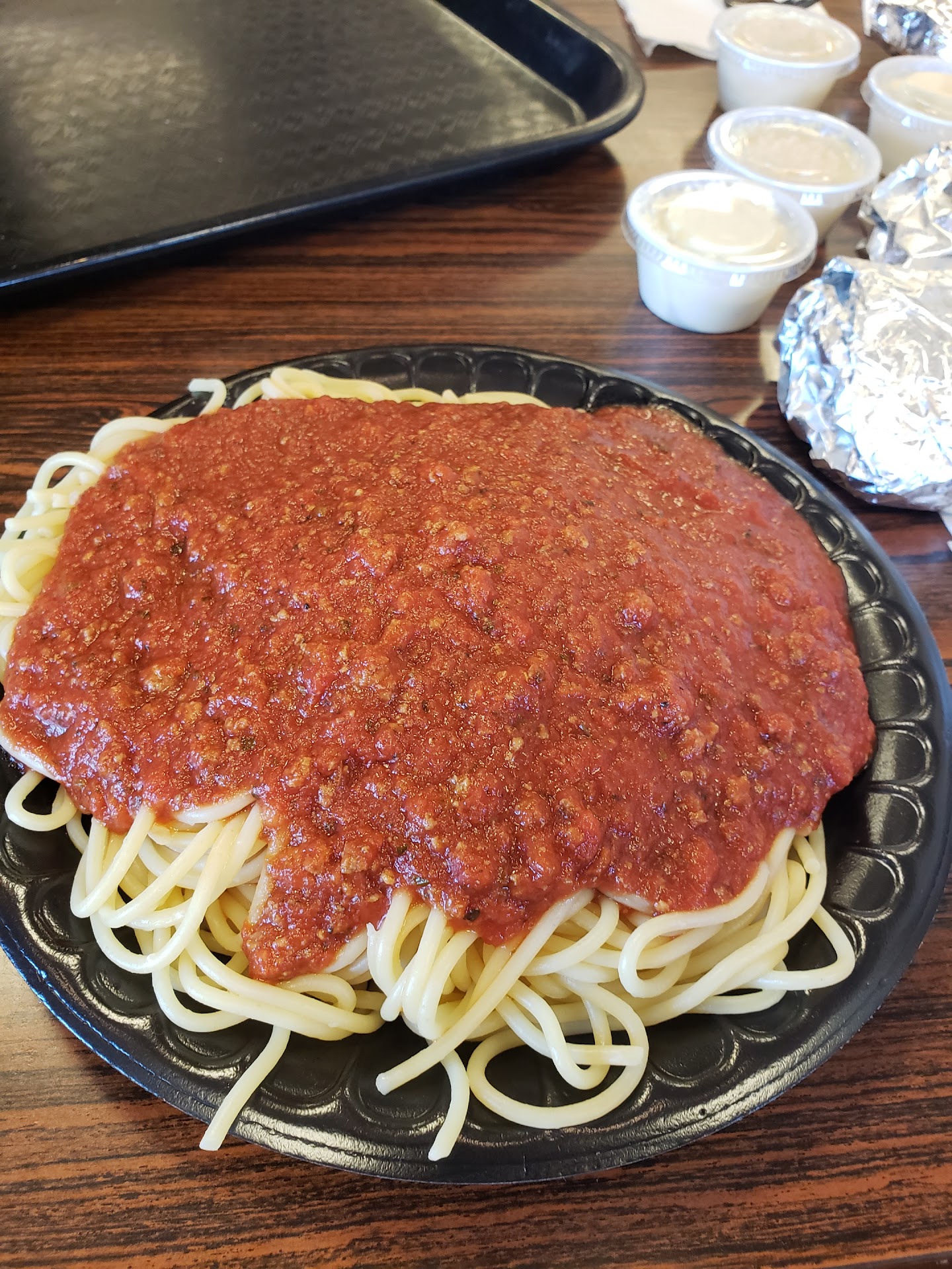 Went for all you can eat spaghetti night. I was told the Alfredo is good, so disappointed that it is no longer offered as part of the All You Can Eat promo on Tuesday and Fridays. For $6.09 it is a good amount of food however you get what you pay for. The meat sauce barely had meat in it and tasted like canned pasta sauce. It didn't have a lot of flavor or spice but it was like food service grade pasta sauce. I was excited to get bread and hoping that the foil wrapped bread was warm /toasted/garlic bread but no, it was just the bread they use for sandwiches cut in half. The young lady working the register was nice enough but there were definitely some workers with attitude when my dining partner asked for more spaghetti & bread. Had the monster cookie for dessert and that was most enjoyable thing about the visit. Decor was outdated and a bit run down but that is always a challenge for local businesses. This is a cheap place to take your family to eat and load up on carbs. Lots of single use plastic and...