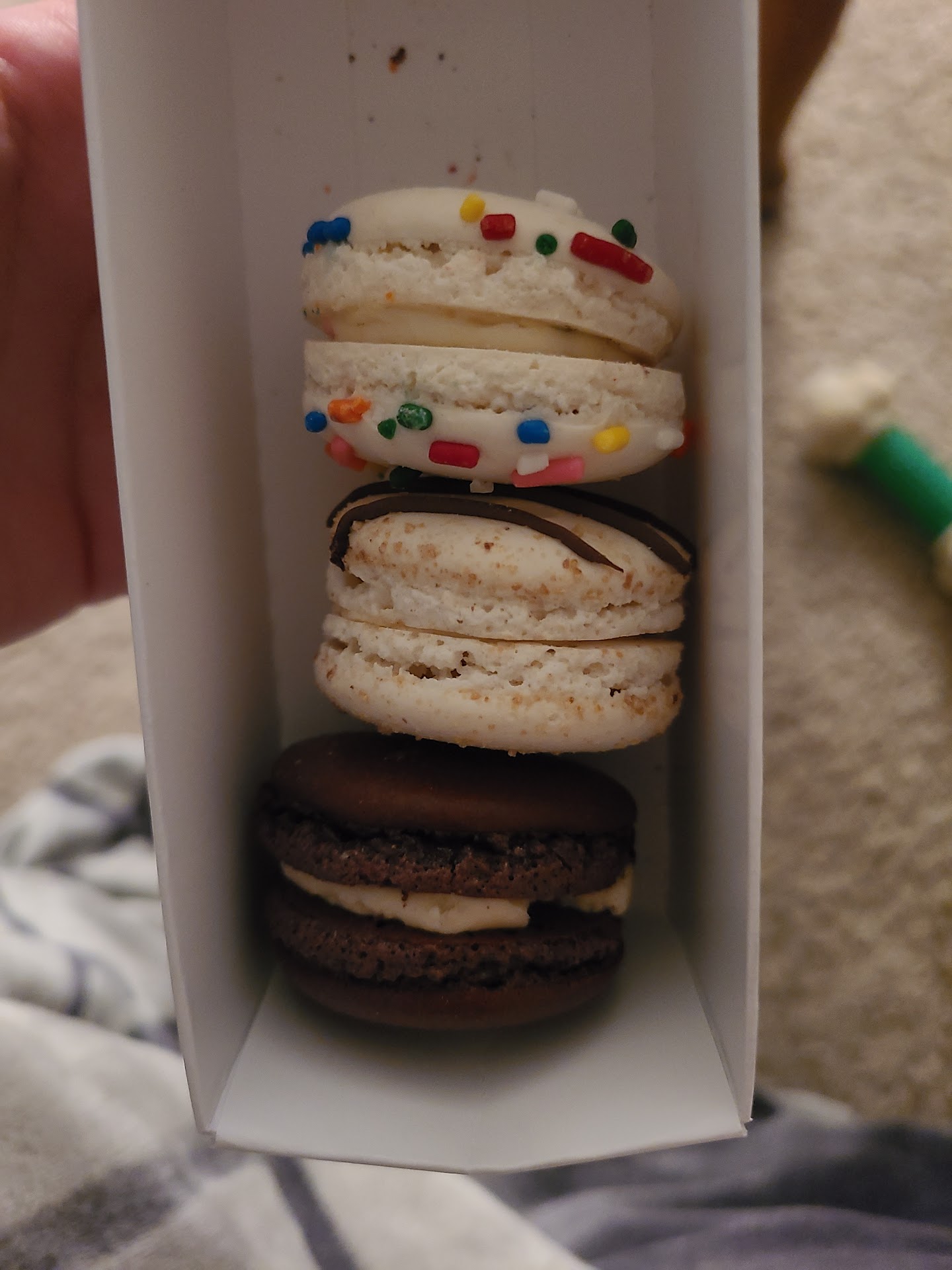 The cookies could be WAY better.The recipe kinda sucks. They weren't uniform and didn't fit into the 10pk box at all.This isn't normal for macarons. The point is to have perfect uniform little pieces of heaven. That was disappointing. They weren't put in the box organized either. I took them out and reorganized, smoothed them over, tilted them backwards to look pretty for my pic.
