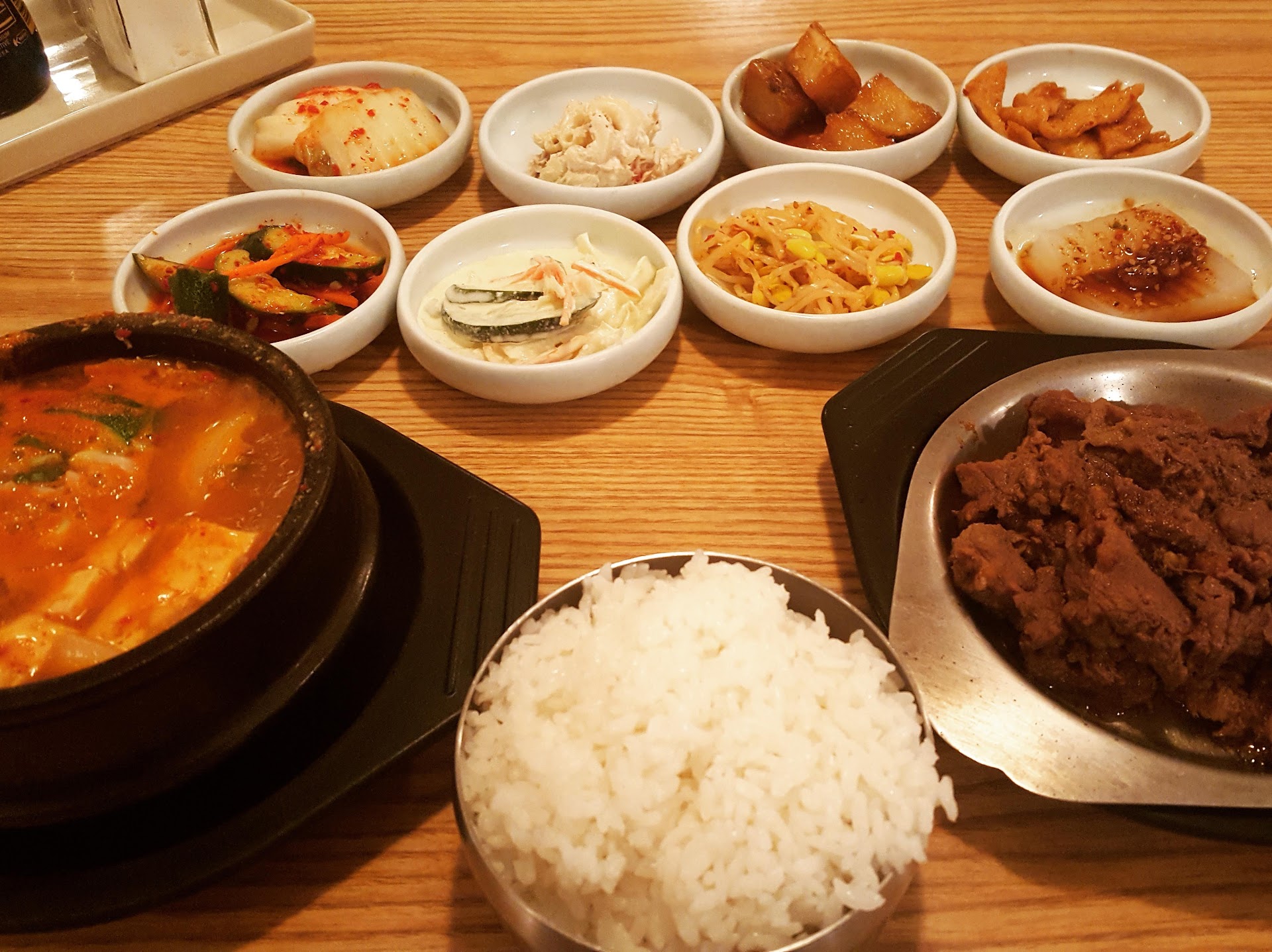 Read moreI ordered the Full Dinner Bulgolgi for $17.99. The "bulgolgi" refers to marinated and grilled ribeye strips (so delicious). The "full dinner" means they also bring soup and the eight small sides (which they offer to refill). The soup is very rich and spicy with beef and tofu and jalapenos in a miso paste broth. The meat and soup are both excellent, but the sides are an adventure all to themselves. The little white dishes hold a range of surprises from some gelatinous thing in a sesame sauce, to tuna macaroni salad I swear just like my grandma made, to some spicy kimchi that will clear your sinuses. There's also these amazing roasted potatoes in a sweet syrup, and a very loose and creamy cabbage/carrot/zucchini slaw. I think my favorite was the sticky noodles with peanuts. The massive variety of tastes and heat and texture at my table right now is simply glorious. I'm not very familiar with Korean cuisine, but I came here tonight hoping for a delicious escape. I am not...