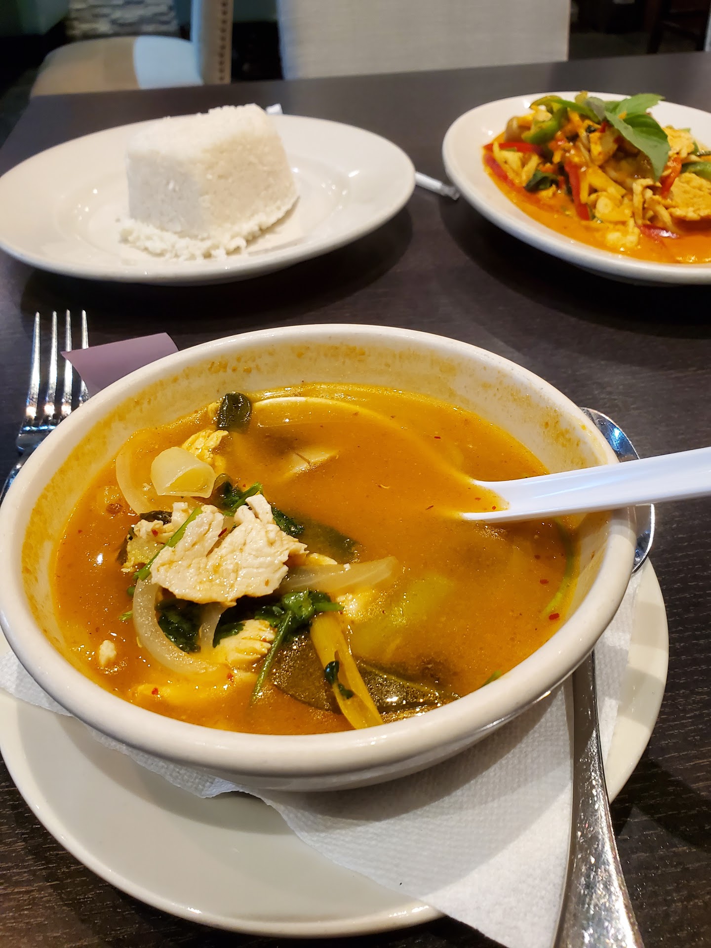 Read moreOrdered a house Cabernet ($5.00), and it was pretty good, especially the very generous pour. For dinner, I was going to start with a small bowl of the Tom Yum chicken soup ($6.99) and then have the Pad Ped chicken for dinner ($13.99), but they both came out at the same time, which worked fine too. The restaurant has a spice scale from 1 to 4 chili peppers -- you won't find any dishes on the menu with 4 peppers, but that is because they ask you how spicy you want the dish when you order it -- even the Tom Yum Gai soup. I ordered the soup with two peppers (medium) and the main dish with three (hot); four peppers is described as Thai Hot! The soup was excellent, and spiced perfectly. The main dish also was excellent, but the heat made me cry. Fortunately, I had a large glass of Cabernet to ease my pain. The serving were generous, and the waiter (David) was courteous, professional,...