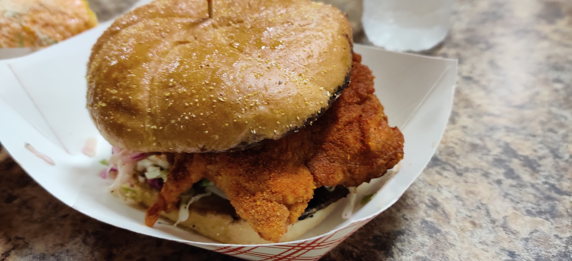 I wonder if they are struggling with the new volume. When they were at the VFW, the food was always fresh and amazing. I've been to the new location twice. The first time was for lunch on a Saturday and it was pretty crowded. The fried pickles were cold and the breading was stale. The sandwiches and the fries were cold, also. Like they were fried and just left sitting until someone got to them. The second time was during the week around 2 or so. Not much of a crowd. Again, the chicken was cold, and the fried pickles were cold. The bar situation is just not a good set up. They have so many good beers and whiskeys to get, but, if you aren't sitting at the bar, there is really no way to get them. I understand that servers are in short supply so having a wait staff for drinks might not be feasible, but the selection is definitely a draw, and to not be able to get a drink after seeing what is available is disheartening. I am hoping these things work out with some more time in the new place. When the sandwich is fresh, it is easily the best chicken sandwich in town. When the dill fries are hot, they are fantastic. They have great specials that always sound amazing, and would be if they were served hot, but that cannot be relied upon.