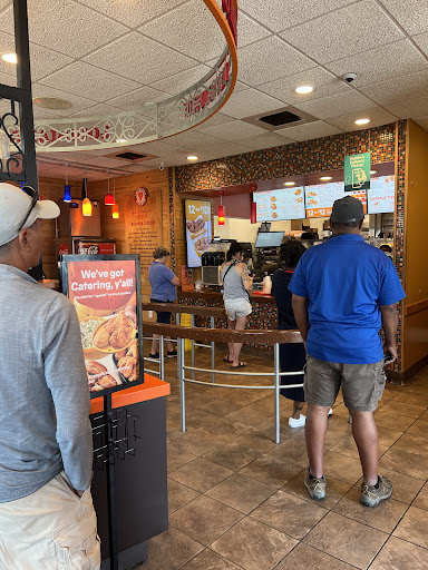 Went through the drive through, ordered the little cajun shrimp things and two chicken biscuits. First time at a Popeye's. Although I was acknowledged immediately when I pulled up to the menuboard, it took quite awhile for the employee to actually take my order. My passenger and I stopped keeping track after 10 minutes. There was one other car in front of us, but we were in line for just under 30 minutes before we arrived at the window. The lady at the window must have been having a terrible day. There was no hello, smile, please, thank you, nothing nice at all. Grabs the money from me, hands back change, and yanked that window closed seemingly as fast as she could. Waited awhile longer for our food at the end of the line where there are windows. I thought maybe they were busy, but from the outside looking in, there were probably 12 people inside at the tables, another 3 at the counter ordering. After another 15 minutes, we had our food. Do NOT go here expecting to obtain and consume your meal and return to work in time to clock back in before the end of your shift.