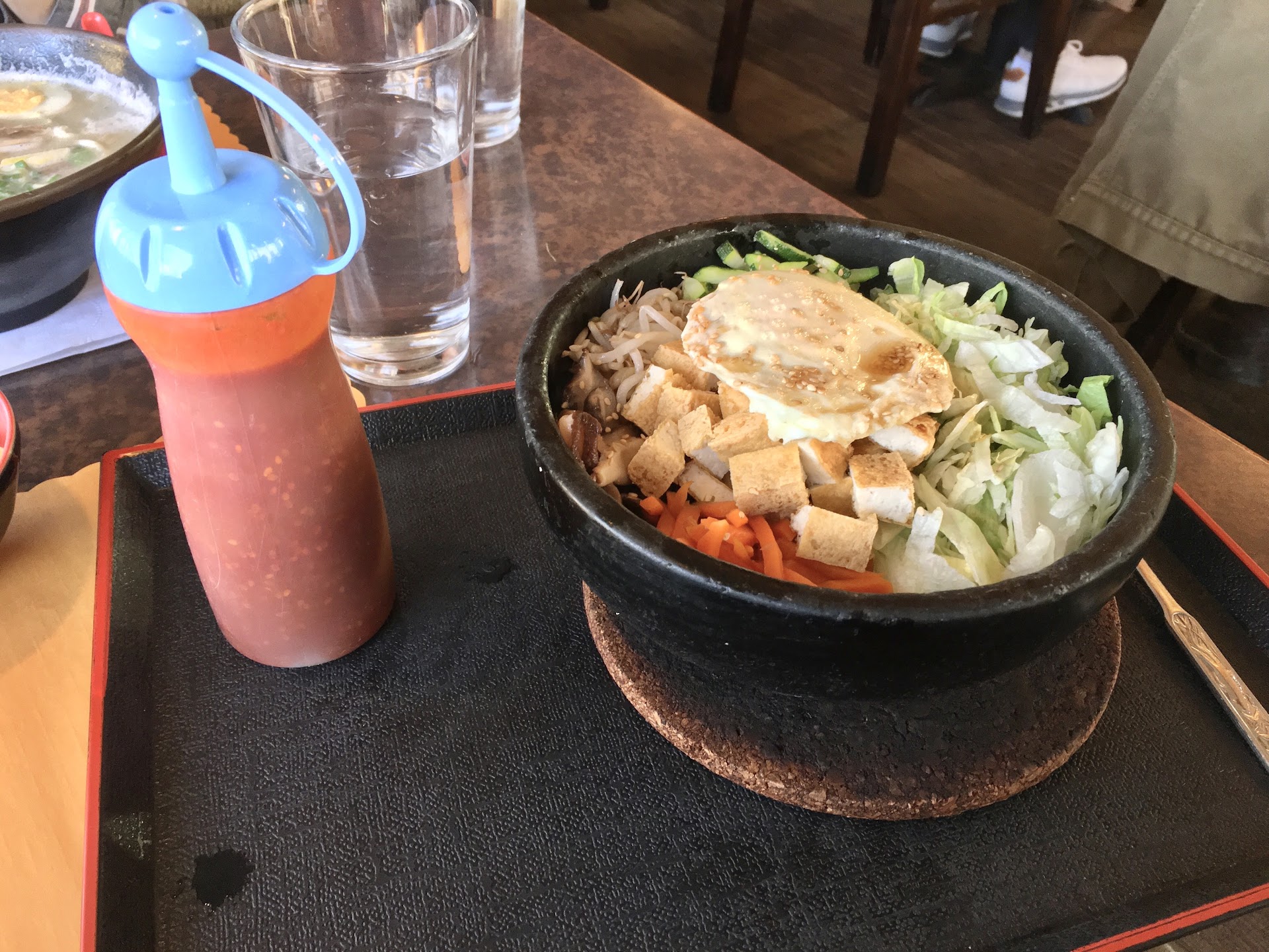 This place was pretty good! The decoration is nothing fancy but itâs definitely nicer inside than youâd expect looking at the outside, and the hidden seating area in the basement is cool. There were a few things marked as unavailable on the menu, but thankfully nothing I wanted, and even so they still had a pretty wide selection of Japanese and Korean food. I ordered the dolsot bibimbap with tofu. Like most meals, it included miso soup and salad appetizers. Oddly enough the kelp in the miso soup stood out to me as being really good - it actually had some texture to it which is unfortunately not always the norm even at otherwise decent Japanese restaurants. The salad was fresh and the ginger dressing was strong and very tasty. The bibimbap was really good! It was my first time getting bibimbap in the stone pot and I was impressed when it came out sizzling and then kept sizzling. The cooked vegetables were cooked just right so that they still had a bit of crunch. The only things off for me were a matter of personal preference - the egg was fully cooked while I prefer a runny yolk, and there was some oil pooled on top, but the oil ended up being not very noticeable. It was nice that the sauce was served on the side so I could dress it to my liking. I had the âoriginal spicyâ sauce which definitely has a kick, but the sweetness cuts it a bit and it wasnât so hot that I had to be sparing with it, but they also have a milder sauce for those that prefer less heat. I was there with one other person, and we got a table right away, but they were pretty much at capacity while we were there. Our food came out pretty quickly, though, especially since they brought out the soup and salad first. The prices were a big highlight - my bowl was only $14 and it was so big that I couldnât finish, not to mention the complimentary soup and salad. Everything on the menu seemed like a good deal. My friend got a combo where he ordered ramen (which also comes with miso soup and salad) and added a roll of sushi for $3 - a ton of food for a relatively affordable price. But despite the low prices it didnât taste cheap - it was simple stuff, but legit good food. Iâd for sure come here again if I lived in...
