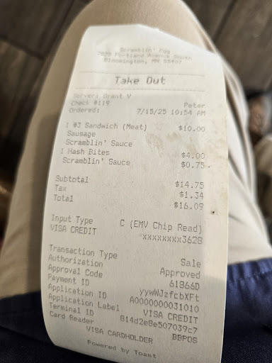 Read moreFirst time at scramblin egg and I'm only a little disappointed, but still give 5 stars because it was tasty. I ordered the sausage, egg and cheese sandwich with the scramblin sauce. The sausage and taste was not what I had expected, I was hoping for a breakfast sausage type patty and not chunks of some sort of chorizo sausage. It had a little spice to it but still tasted good, just not what I had expected. I guess I should've read the non-5 star reviews before ordering, because this "sausage issue" was brought up before. Next time I'll be ordering bacon, hope that those will not be bacon bits, jk. The bread was toasted perfect though and the egg and cheese were delicious. Overall a great sandwich, and filling. The best part though were the hash browns, they were awesome. They reminded me so much more of German potato pancakes than American hash browns. I got the scramblin sauce with it, but they don't need any sauce, they are so tasty without it. If anything I would recommend to serve them with applesauce, maybe they can add applesauce as a side item, that'll be awesome. Prices were fair for today's standards. $16 total for the sandwich, hash browns and a side of scramblin sauce. I probably won't be making an extra trip down here, but if I'm in the area before 2pm I'll drop in...