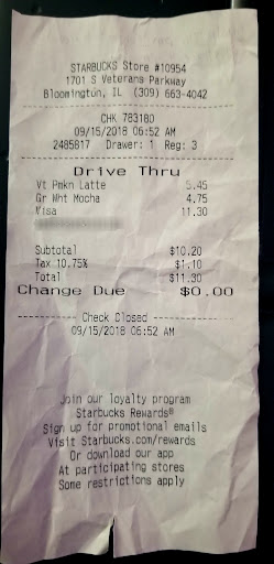 Read moreI stopped by this Starbucks location thru my drive towards I-55 Northbound and this is my first time on this location Bloomington September 15,2018 at 6:52am. I have purchase Starbucks coffee for so many years at even the most busiest day I always get my order right, as I went back to I-55 I ask my husband to check my coffee a Pumpkin latte shouldn't be too hot and liquidy as he open the lid it was just plain coffee I contact the store immediately I had an appointment 2hrs away and I could not got back for my order to make short story I had spoken to two store managers and as promised to fail on my purchase order of a pumpkin latte I would receive a starbucks gift card. I told them I can send receipt if they like. I love Starbucks and I am very disappointed of how nothing has arrived at my mail. Is already October 18,2018. Customer service is totally not your priority. I do plan to contact corporate office about this matter not for the coffee but because your quality of coffee should reflect on customer service as well, like other locations. Contacting you more than 5 times doesn't show patience and time?.I really don't think you are more busy that a downtown Chicago...
