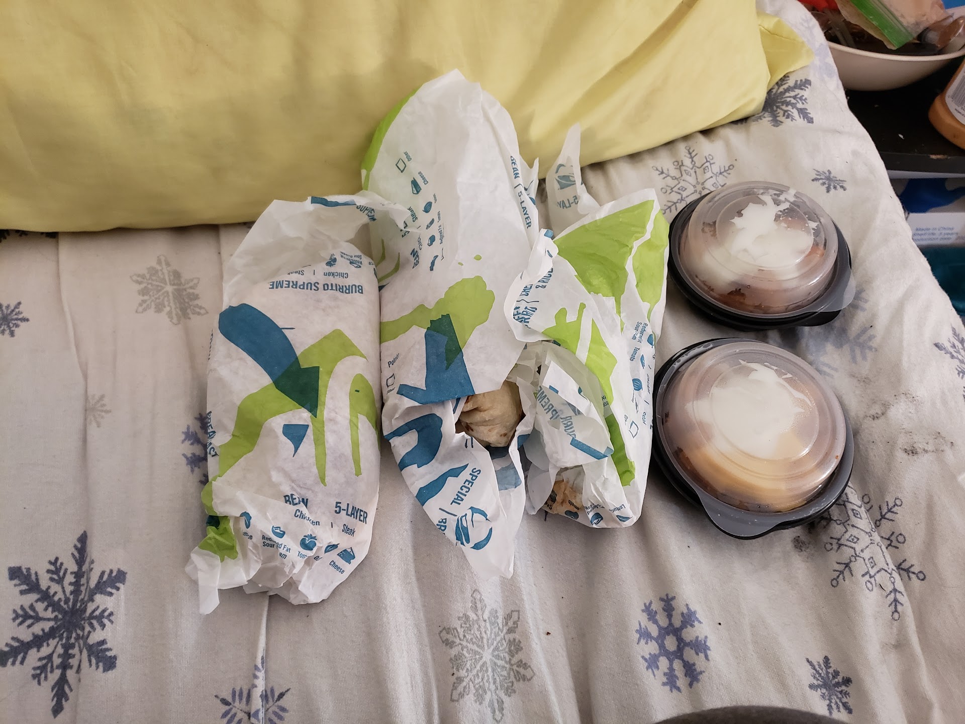 I arrived and went through the drive through as I was on my way home. I ordered the five dollar fill up and an extra taco supreme and a Pepsi. When I got my order it was cold and the Pepsi was a small when they usually give me a large. I brought up the Pepsi as it was the only thing I noticed incorrect right at the gate. The young woman explained to me that it only comes with a small. If I remember correctly her exact words were " Well, that's what you get" . Puzzled by her demeanor I just replied " oh, ok" I pulled up and checked my food, and found it to be not quite cold... I'd say Luke warm, as if it was sitting for 20 minutes or so. I assumed they pre made the boxes or I got someone else's food that changed their mind on their order. I pulled back around and sat at the intercom to explain the issue. I sat there for approximately 5 minutes and was never greeted. I drove up and waited an additional 8 minutes before I was acknowledged. I know this because after 5 minutes I was watching the clock. Finally a young man came to the window and said "hey what's up" I said not much but my foods kinda cold. He laughed probably to lighten the mood not because it was funny. Still I was not in the mood for laughter. He replied with " I got you " and took my bag. He gave me a new box and said " your all set, have a good one" I said thank you and drove home. I was done dealing with anything else. It didn't matter at that point as I worked very hard all day and just wanted to go home. I got home and grabbed my food and found it was just thrown in and the lid was smashed down on top of the contents. I shook my head and scoffed. When I started to pick through this mess I had to call dinner, I realized it was missing the extra taco supreme and...
