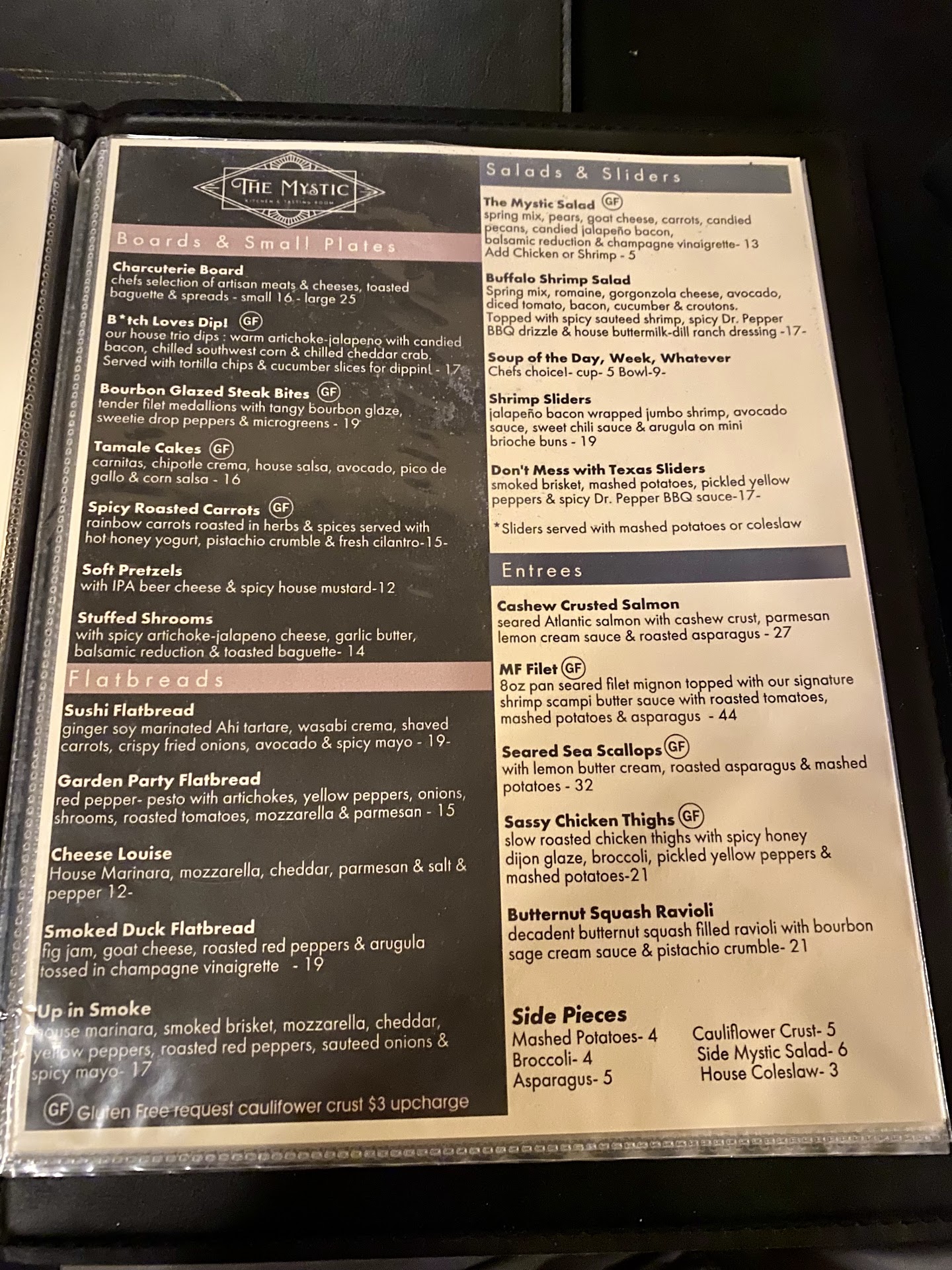 Read moreA friend and I tried Mystic Kitchen for dinner tonight, and it was fabulous! Parker was our server and patiently answered our several questions about menu items. He thoroughly knows the menu and makes super recommendations. The menu items can be modified based on your preferred tastes also. The menu is short but was difficult to choose one item. I did not look at the appetizers, because I wanted room for dessert. My friend isn't fond of hot, spicy food but was interested in the shrimp sliders. Parker recommended a mild option and my friend thoroughly enjoyed them. She chose the loaded potato salad and said it was deliciously tasty-the potatoes had the perfect texture. I wanted the cashew crusted salmon or the butternut squash ravioli. I asked about the protein in the ravioli dish; Parker recommended chicken and left room for dessert (I also asked about that.) My meal was a fantastic example of comfort food: a sweet, savory, creamy hug for my tummy. We both ate the sticky toffee cake for dessert and enjoyed it: decadent sweetness but not heavy. Seating matters: when I walked in, I thought the music was a little loud and I wouldn't like the experience; however, we were seated in the next section, which was much quieter and more...