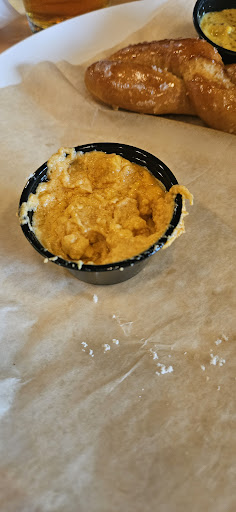 The beer was great! However, the food lacked! Our starter was the pretzels with beer cheese. We got 3 pretzel twists and 2 dips in small ketchup cups. One was just straight Dijon, nothing special, very acidic from vinegar. The second was the one we were excited to try, the beer cheese. Tried to dip nothing stuck to the pretzel, just made an indent in the cup, finally scooped some up, and I got the worst taste and feel in my mouth! It was gritty like chalk was not creamy, did not taste good at all! So we just ate a pretzel twist, which was very dry and crumbly almost seemed like they were frozen and got freezer burned. Onto the main courses! I ordered the Americana Burger, and it came with pickle lettuce onion and fries as a side. I was excited because the beef was locally sourced! It was just a burger! I'm very sad to say I had better burgers at Wendy's! It had no flavor! It was merely sprinkled with shredded lettuce, had a super thin slice of onion, and 3 super thin pickles and what seemed like a sad attempt at a thousand island type sauce very little amount. The fries were cooked from frozen pretty well. They were good with ketchup. My husband ordered the chicken sandwich, and it came with coleslaw and sweet pickles on it. He said it was ok on the flavor, just not quite there, and the chicken was beaten to death before it was breaded and fried too long. The slaw needed more flavor! The pickles were thick sliced and good... It's a pickle. His fries were good, too. Honestly, I think they need to integrate fresh, not frozen. I feel bad for the local farm they support because the burger was not great! It needed some nice crisp lettuce slices, a red onion slice, house made or locally sourced pickles, a slice of tomato, more seasoning on the sauce or do like a real American burger and put mayo and ketchup on it or on the side. Don't mash and knead the beef so much it makes it dry! Really make that locally sourced farm fresh beef shine! The fries are good! Add some seasoning to your chicken sandwich! Go to Florida or Georgia or Alabama and get that same sandwich.... mmmm, taste that slaw and those pickles! Perfectly cooked chicken... That's what some of us expect to get when that southern food is offered. The staff was friendly. The atmosphere was weird. Maybe because we were sitting between the entrance door and the patio seating door... idk 🤷♀️ never been stared at so...
