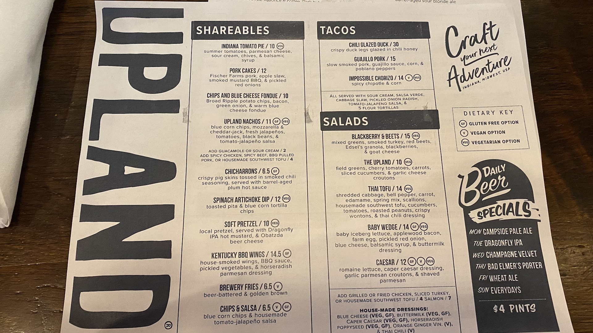 Read moreI want to give Upland a 5 star review. I really, REALLY do. My husband and I are from Grand Rapids, MI and have been following (or maybe, stalking) sour beer since 2014 when we first started dating. Over the winter, we tried an Upland sour at the 7 Monks Taproom in GR and were blown away. We thought, that's it! We have to go to Upland over Memorial Day when we have time off. So, yes, we planned a vacation to Bloomington to visit Upland. We arrived Friday night around 10pm to the restaurant. We called ahead to make sure they were open and that they were still serving food. They said YES. We arrived and the restaurant was not busy. It appeared there was a rehearsal dinner in their back room earlier that evening. Chairs were already up on tables. We sat out in the garden area and ordered our first sour. Amazing! The garden area is beautiful. The humidity is just right with a breeze cutting across the field. Our waiter comes back for our food order and he promptly delivers the black bean burgers. However, he sets our plates down and darts off and we don't have time to order another beer. The burgers are SPICY and my husband and I are both forced to stop enjoying our meal until we have something to drink. Fast forward 40 minutes and we are still waiting for someone to check on us and see if we're ready for another beer (or maybe just bring us water!). We finally flagged someone down to grab us another water and she seemed irritated that we had done so. It was clearly apparent that something was going on with the staff that evening. Other customers were complaining about the service and we could see the staff arguing through the doors into the main brewery. Maybe they were short staffed? Maybe something happened in the kitchen? I'm always one to give people slack when it comes to service because I know stuff happens but this got to the point where I was laughing at how awkward and uncomfortable the atmosphere was. Unfortunately, we'll be enjoying our Upland beer from home...