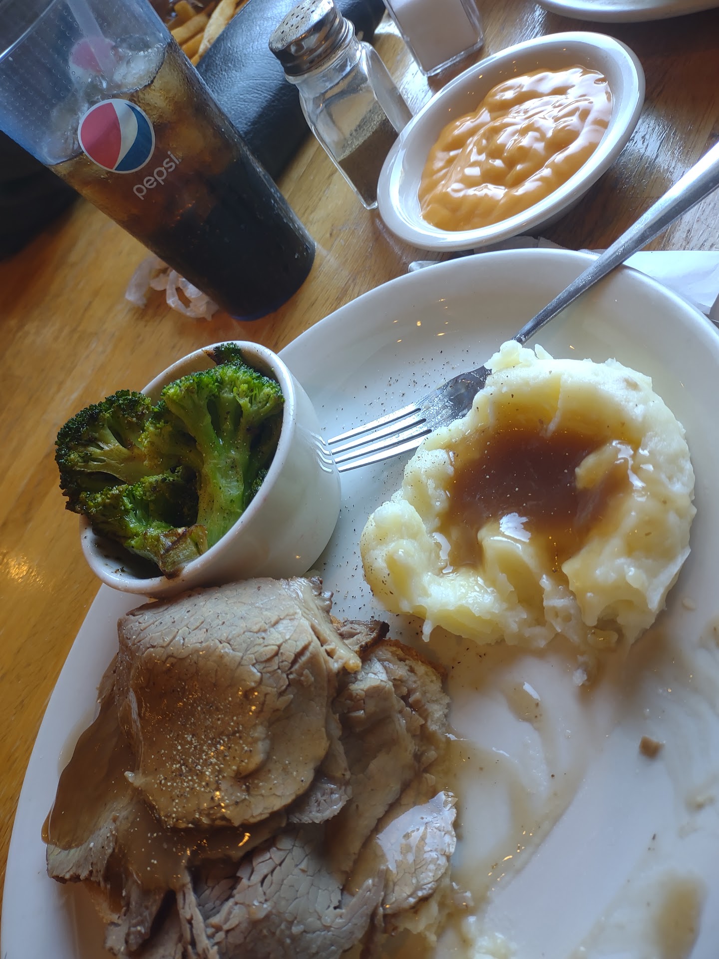 Beautiful, new looking building. The atmosphere inside is clean rustic mixed with modern design and super comfy seating. Staff was polite, restaurant was busy, and while the wait for a table wasn't too long, I can't say the same was true for our order delivery. We ordered two of the Sunday specials, open faced roast beef/mashed potatoes, both with sides of grilled broccoli and both with the cheese added for an additional charge. Our son ordered the fried pork chops topped with brown gravy, grilled broccoli + the $chz, and french fries. The wait for our order bordered ridiculous, but we try not to make much fuss as we understand things like being short staffed, certainly during peak times does happen. We woke up nearly two hours after having entered to find our server placing the meals be4 us. It looked delicious despite all three orders of grilled broccoli not being served with the cheese. As it's an extra charge I did call it to the servers attention and eventually another lady brought out one small side of cheese sauce for us to share. She did say we could feel free to request more but we didn't dare risk the wait. We all began tasting our dinners and discovered the Sunday specials to be quite cool. Not wanting to complain, really not wanting additional wait time, and building up a serious appetite in the 1hr 46min wait to see our food delivered the husband and I cleared our plates regardless. Our son enjoyed the pork chops but wasn't a fan of the fries and wouldn't attempt the broccoli without it cheese topping. Final disappointment here was not receiving an apology or discount for such a lengthy delay of our day and not finding a credit for the extra cheese sauces we never got. Perhaps u will find a better experience but it's doubtful well return since the costly stop was not worth the time...