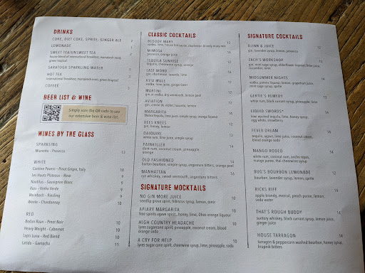 Read moreEvery aspect of this place was incredible. I went for dinner with my parents at this restaurant less than 2 hours ago. We made a reservation an hour before we ate and we were very lucky to get in as it was very busy and not a massive space. We scanned the menu and my mouth started watering. We unfortunately decided to skip starters as we had just had some chips at a pub down the road whilst we were waiting for our table. For a drink my parents had a bottlw of wine to share and a beer and a cocktail. I had a 'surprise me' mocktail which was a mocktail that had been made specially. There was a bit of confusion in the bar and I got two of them instead of one but whose complaining about that. They were both delicious. Instead of a starter we had a cup of soup. I had chicked and dumpling and my dad had the same. My mum had the white bean soup and they were both lovely however there were no dumplings in the chicken and dumpling soup. I did find some dumpling wrappers in it though. It was delicious however. For the mains (entrees) My dad had a wagyu burger and fries, my mum had almond crusted trout with hopping jons (rice, beans and black eyed peas) and beans and greens. But let's talk about my main. It was the best thing I think I have ever eaten. I don't think I can talk enough about how incredible this tasted. It was a peppery bone-in grilled pork chop which was cooked medium and was deliciously tender and juicy. It came with a buttery ricotta stuffed ravioli covered in what I believe was a demi glacé sauce. It also had local mushrooms and pumpkin seeds for a great crunch. If anyone working there is reading this I would love the recipe for the whole dish. I also ordered a side of moonshine roasted carrots which were just a little to crunchy for my liking but the flavour was incredible. Unfortunately we made the staff work later than usual as we left late. They were lovely about it and didn't seem to be bothered by it, our waitress was a really lovely woman and tended to us really well. The atmosphere in the restuarant was amazing and bustling. Even more Unfortunately we didn't have dessert, (we didn't want to make them work any later) we were full and it was late. I will make a flight from the UK to the US to go to that restuarant. The only sad thing about it was that the pork was only a seasonal dish. It is a must visit if you are in or near the area. Immaculate food, staff and a beautiful location. You will regret if you don't make a...
