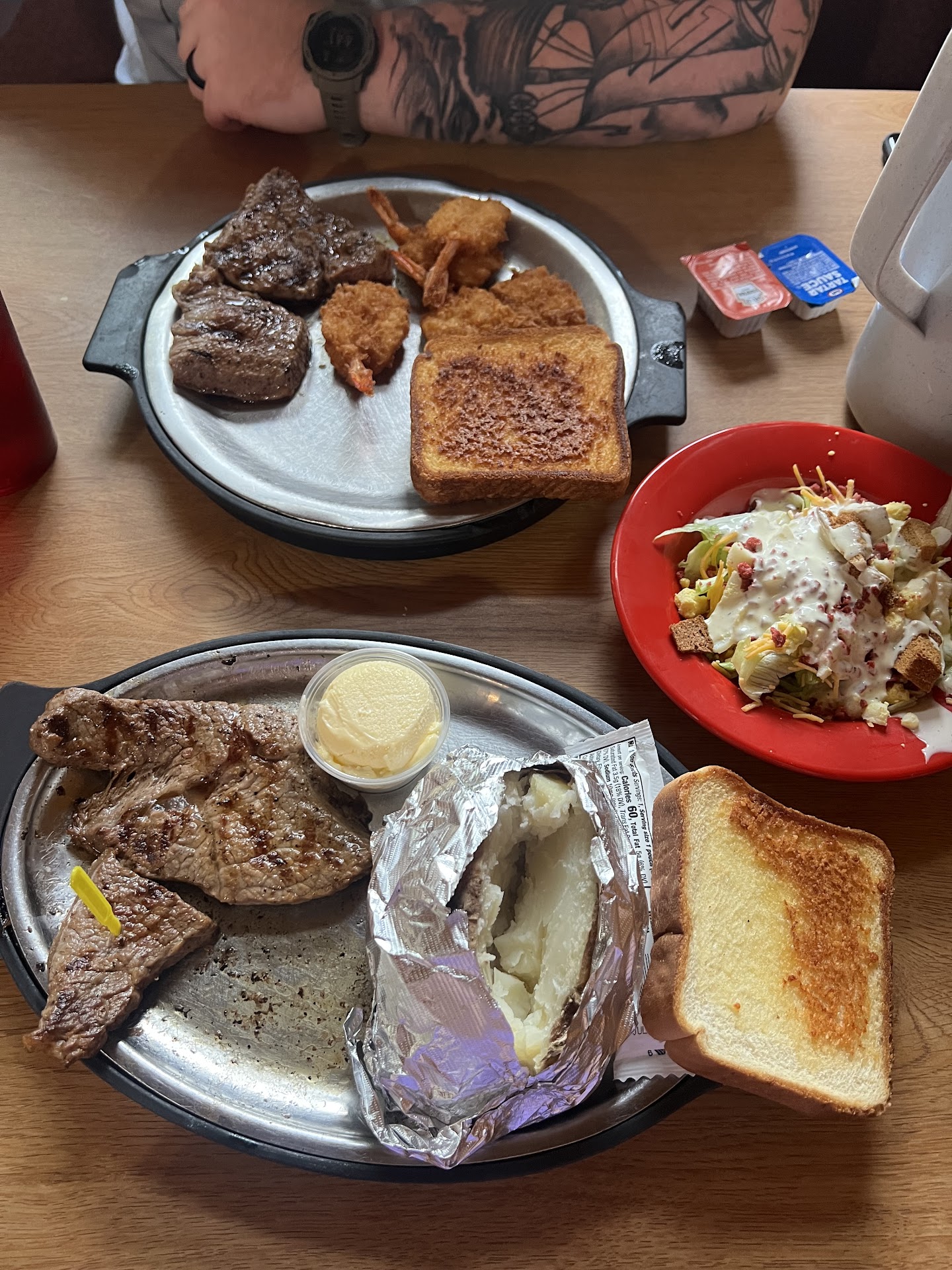 I’m not even sure I have an accurate star count. We are from out of town and let me just describe our experience for you: We first walk into a lonely room wondering do we stand here and wait for our hostess? We then realize we may need to walk through the next door. Oh boy..There is a literally light up menu on the wall and a older lady asking for our drink order. We are caught off guard, we tell her our drinks. People show up behind us and She is getting a bit grumpy and rolls her eyes bc I have four children, so we are still letting her know our drink order. We are honestly just trying to understand is there buffet or is this order here type place... then we have to ask her do we place our order here? Yes, you do! We then place our order and are handed cups of ice bc our tea is suppose to be delivered to our table? Oh and don’t forget to grab your own silverware… of course, I forgot my steak knife 🤦♀️ Then after all that you seat your self.. which was definitely a lil more complicated with a large family.. after choosing the second room I sat in my bamboo chair and it felt a tad rickety so I decided on a booth. After settling in, a family next to us literally broke a bamboo chair and they where actually pretty small individuals. We got our food next. The burgers where just normal almost “school like” burgers my oldest said. You get condiment packets with them. 🤦♀️The steak was pretty bland. So if your looking for grilled seasoned steak, this isn’t it. It’s like a pan seared steak. My Baked potato came with nacho cheese, which was pretty good. The boys did love their catfish and fries. Peach cobbler which Comes with your meal self serve, was ok but ice cream was just ice? Not sure why there was no taste. There was no Togo boxes being brought home this time. that’s something we usually always have. Over all I wouldn’t go back. I honestly wouldn’t even consider this place to be a steak house. The look from the outside and even some of the review photos are misleading to me. This place is a major guessing game and the friendly staff that was there five months ago didn’t exist...