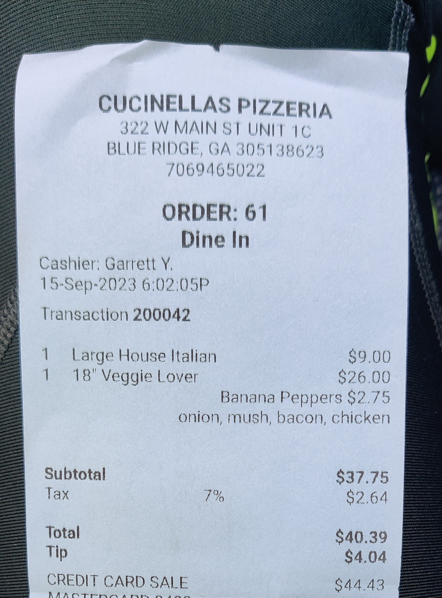 Read moreFirst time trying Cucinella's. I love the pizza. They were swamped today (all of us tourist in town). Altjouvh they were running 45 minutes to just over an hour to get a pizza out, they still made my pizza with half having no cheese with no issues. They were friendly when I called and placed the order and were trying hard to take care of the TONS of folks in town that clearly didn't look at all the other restaurants to see they had no openings for a couple of days, as they came in to the down town tourist part of Blue Ridge. They had all hands on deck, the kitchen staff were all doing their designated task (didn't look like chaos, didn't see staff running around not being productive). The two deaignated to take orders remained friendly and did a great job grabbing pizzas as they came up and kept the flow of customers placing orders handled. It looked like everyone knew their duty and stayed on it. The pizza was great. I love pizza and was worried that it may not be as good as the restaurant had smelled walking by this week. It did not disappoint. I will definitely eat here again when in Blue Ridge. For those grumbling about an hour wait for pizza, that came in and acted shocked while I waited to pick up my order, think about the fact that it's the day before New Years Eve and think about all the people you bumped into while walking through shops today. The pizza oven was huge and from what I could see they kept it full and steadily shifting pizzas around to cook properly. I was impressed, after being in retail for over 20 years, at how well the restaurant...